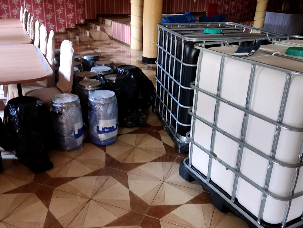 Podczas przeszukań posesji policjanci znaleźli i zabezpieczyli około 1300 litrów chemikaliów mogących służyć do produkcji substancji psychotropowych oraz narkotyki w postaci marihuany i mefedronu. Ponadto funkcjonariusze na poczet przyszłych kar zabezpieczyli blisko 40 tysięcy złotych. Wśród zabezpieczonych przedmiotów znajdowały się również telefony komórkowe, a także inny sprzęt elektroniczny.