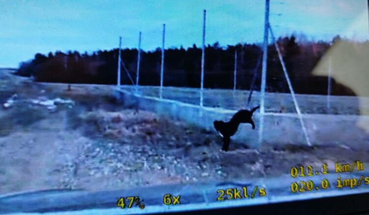 Policjanci z Wydziału Ruchu Drogowego Komendy Powiatowej Policji w Mławie otrzymali zgłoszenie o psie uwięzionym w siatce ogrodzeniowej w pobliżu trasy S7. Zwierzę tylną łapę zaplątaną miało w siatkę i, jak wynikało ze śladów, znajdowało się tam od dłuższego czasu. Ziemia wokół była wyraźnie poruszona, co wskazywało na próby oswobodzenia się.