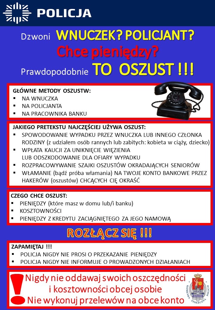 Pamiętajmy o zasadach bezpieczeństwa, szczególnie w przypadku jakichkolwiek próśb przekazania lub przelania pieniędzy. Policja, prokuratura, pracownicy poczty oraz przedstawiciele banków i innych podmiotów NIGDY nie proszą o pieniądze!