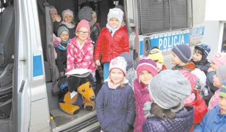 Policjant dodatkowo rozmawiał z ?Misiami? i ?Motylkami? i zadawał pytania 4 i 5-latkom oraz ich opiekunom, dotyczące bezpieczeństwa w ruchu drogowym w podróży, w domu i na podwórku. Niezwykła atrakcja dla dzieci był też przywieziony przez funkcjonariusza policyjny pies ?Misiek?? pluszowa maskotka, którą wszystkie dzieci chciały głaskać i do której się przytulały. Kolejny już raz należy stwierdzić, że nawet najmłodsze dzieci i ich opiekunowie posiadają dużą wiedzę na temat naszego wspólnego bezpieczeństwa i pracy Policji.