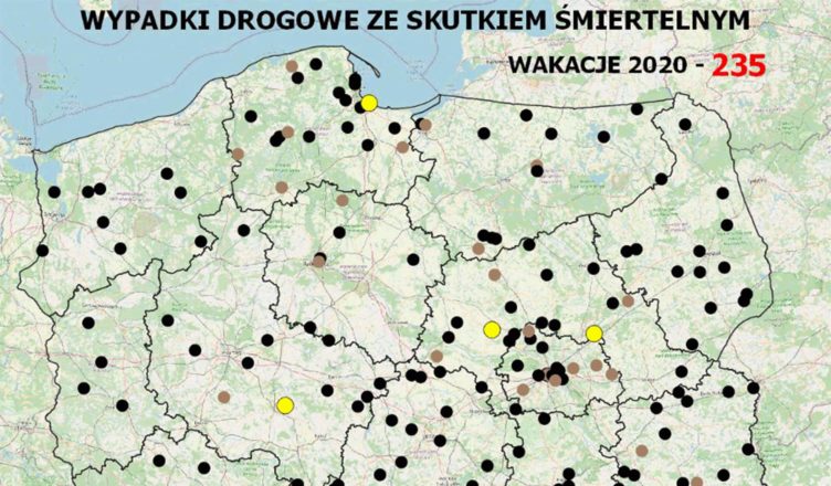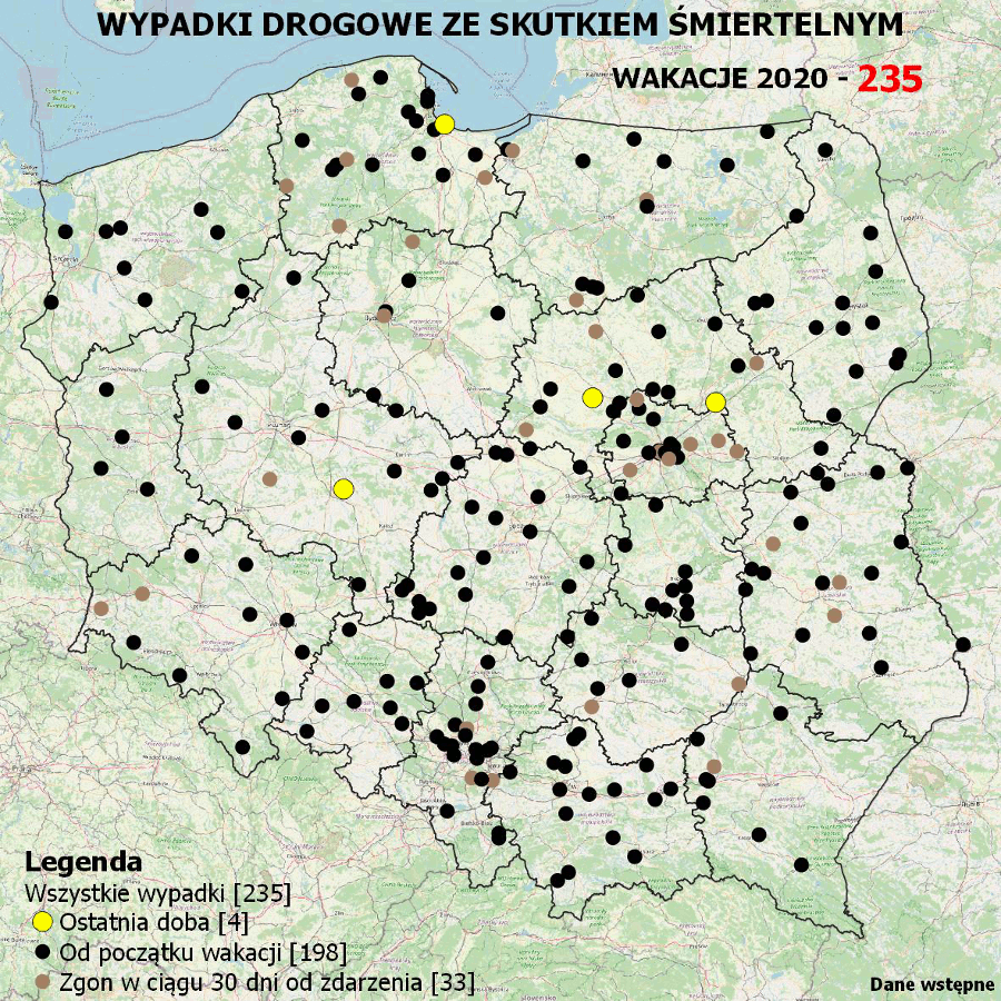 W ciągu ostatniej doby w wypadkach drogowych zginęły 4 osoby. Od początku wakacji ofiar śmiertelnych na drogach naszego kraju było 235. Policja prezentuje kolejną dramatyczną odsłonę Mapy Wypadków Drogowych.