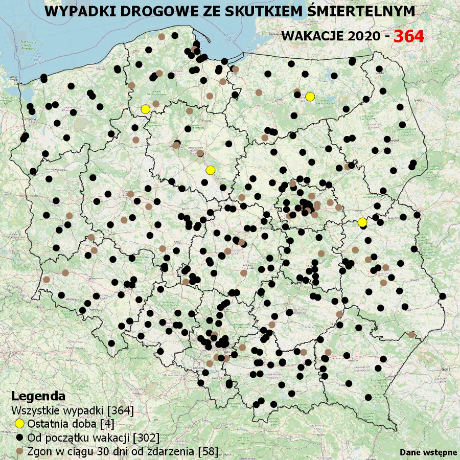 W ciągu ostatniej doby w wypadkach drogowych zginęły 4 osoby. Od początku wakacji ofiar śmiertelnych na drogach naszego kraju było 364. Policja prezentuje kolejną dramatyczną odsłonę Mapy Wypadków Drogowych.