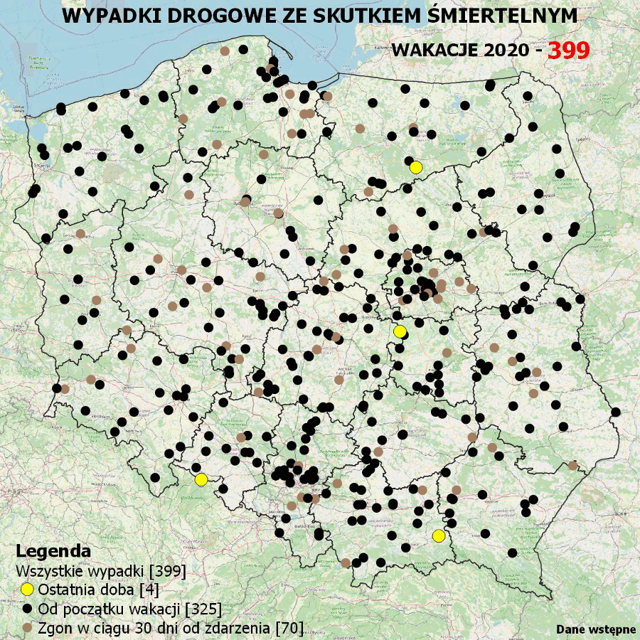 W ciągu ostatniej doby w wypadkach drogowych zginęły 4 osoby. Od początku wakacji ofiar śmiertelnych na drogach naszego kraju było 399. Policja prezentuje kolejną dramatyczną odsłonę Mapy Wypadków Drogowych.