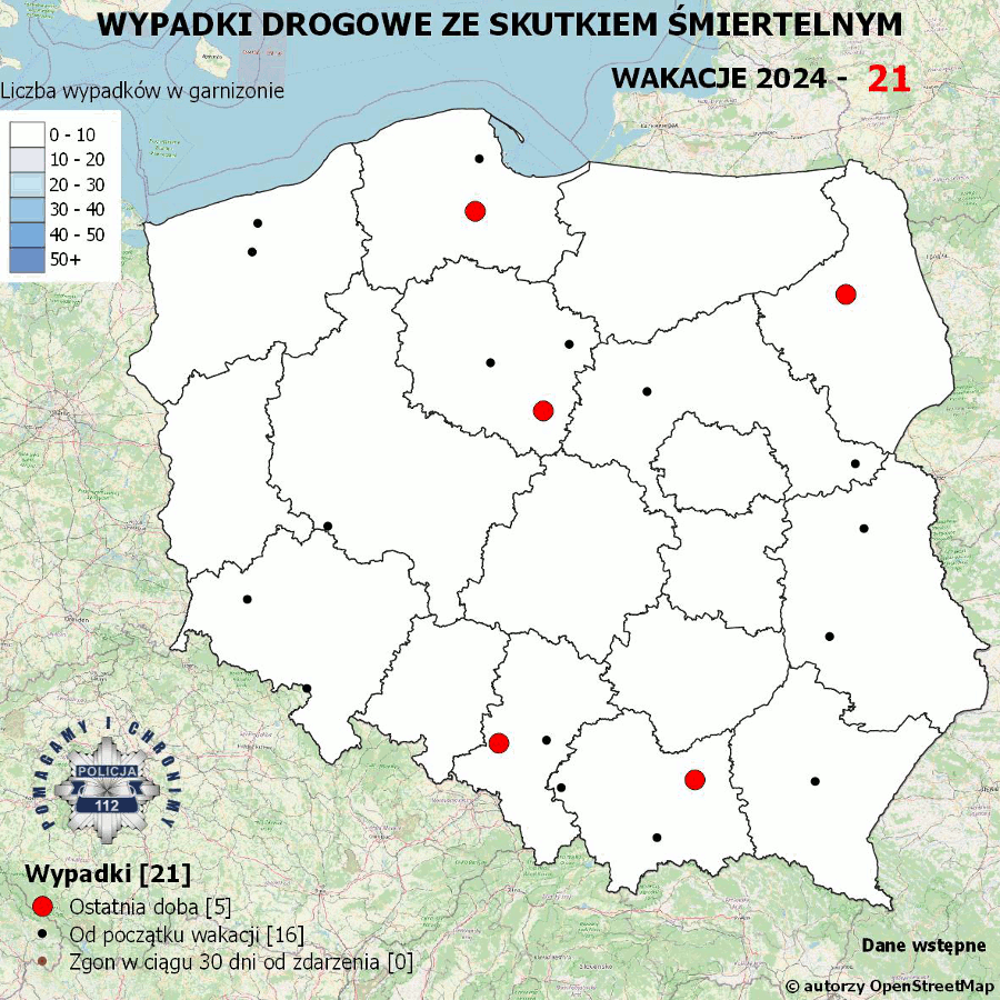 W ciągu ostatniej doby w wypadkach drogowych zginęło 5 osób. Od początku wakacji ofiar śmiertelnych na drogach naszego kraju było 16. Policja prezentuje kolejną dramatyczną odsłonę Mapy Wypadków Drogowych.
