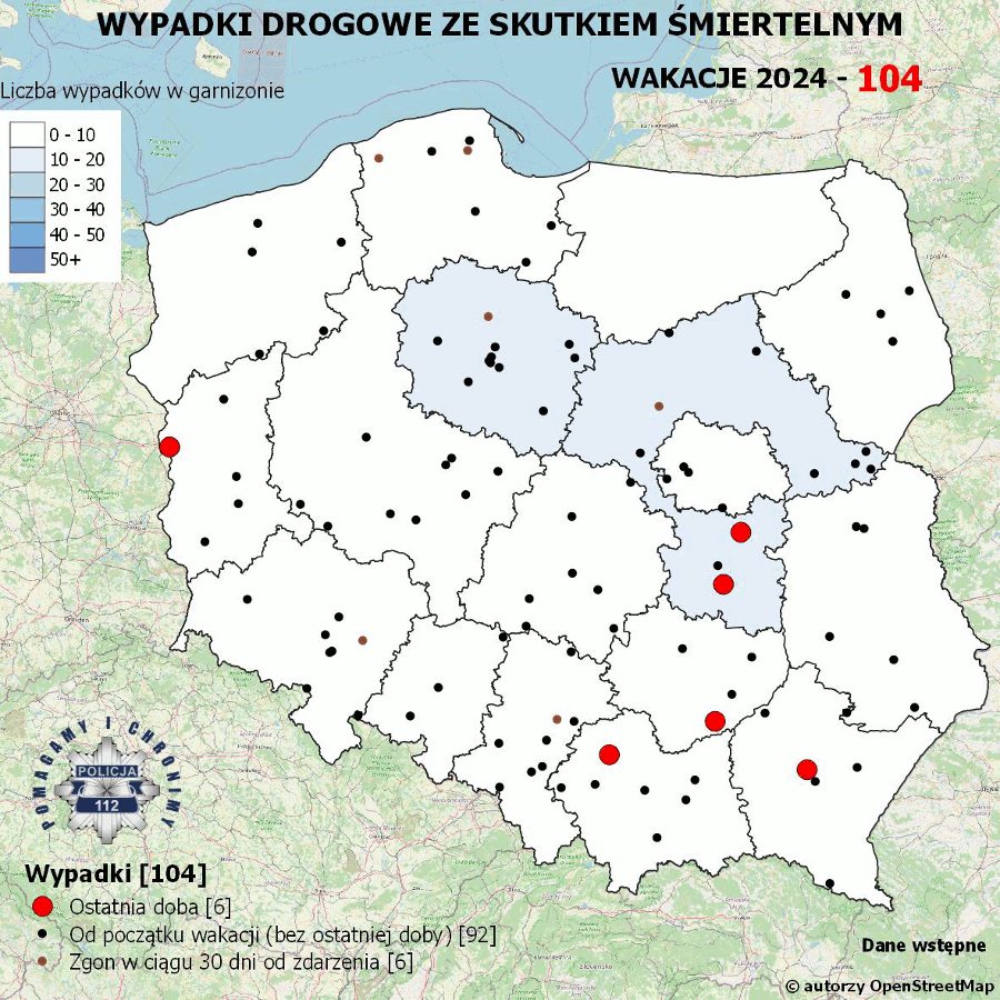W ciągu ostatniej doby w wypadkach drogowych zginęło 6 osób. Od początku wakacji ofiar śmiertelnych na drogach naszego kraju było 92. Policja prezentuje kolejną dramatyczną odsłonę Mapy Wypadków Drogowych.