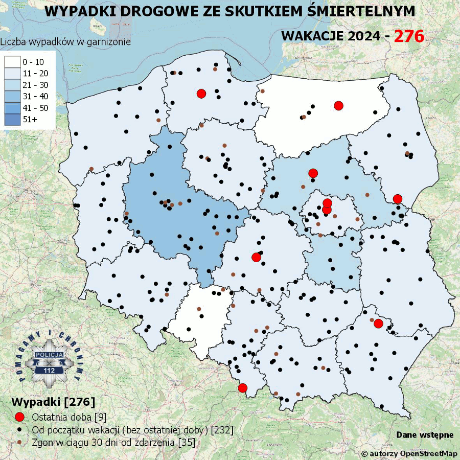 Policyjna mapa wypadków drogowych ze skutkiem śmiertelnym – Wakacje 2024