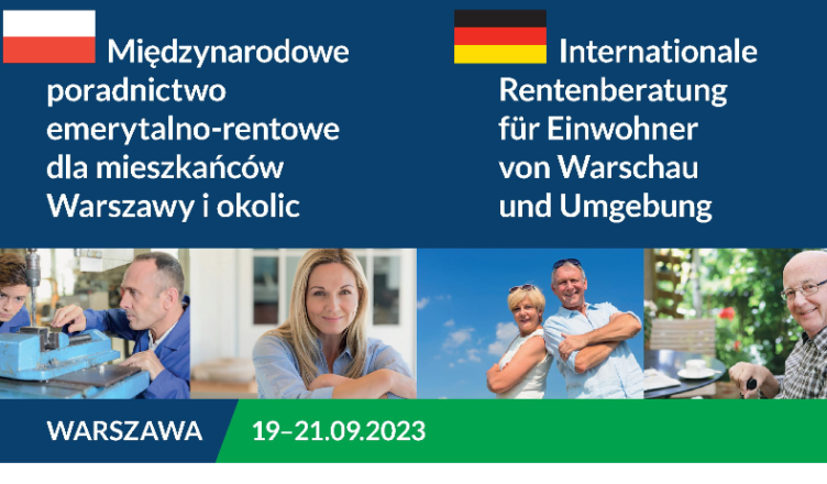 Zakład Ubezpieczeń Społecznych organizuje w dniach 19-21 września 2023 r. Polsko-Niemieckie Dni Poradnictwa Emerytalno-Rentowego. Eksperci instytucji ubezpieczenia emerytalno-rentowego obu krajów (Zakładu Ubezpieczeń Społecznych oraz Deutsche Rentenversicherung) będą udzielać bezpłatnych porad i konsultacji w języku polskim i niemieckim. Dni Poradnictwa odbędą się w siedzibie I Oddziału ZUS w Warszawie przy ul. Miodowej 5.