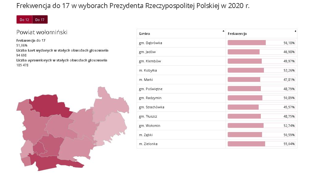 Według informacji podanych przez Państwową Komisję Wyborczą na godzinę 17:00 frekwencja wyborach prezydenckich przekroczyła 50%. W powiecie wołomińskim najwyższa jest w gminie Dąbrówka, najniższa w gminie Strachówka.