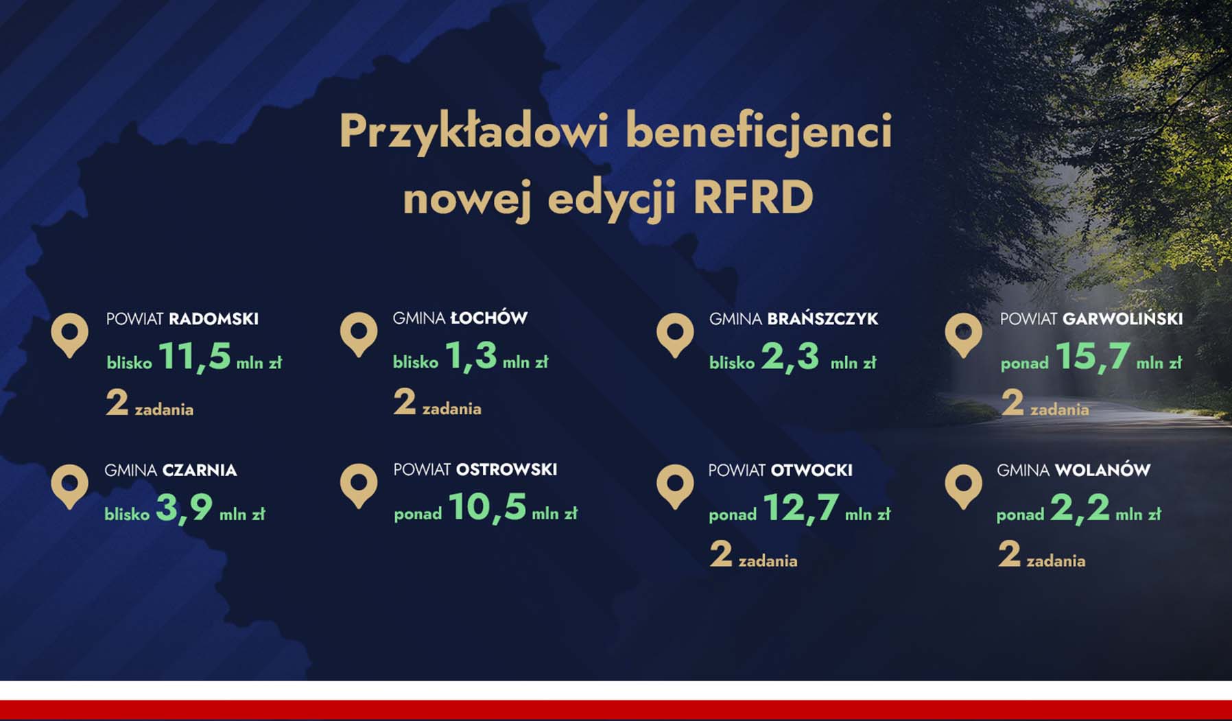 - Powiat Radomski – dwie umowy na łączną kwotę prawie 11,5 mln zł na rozbudowę drogi powiatowej nr 3560W Ruda Wielka – Dąbrówka Warszawska oraz remont drogi powiatowej nr 3513W Nowe Zawady – Bierwce oraz drogi powiatowej nr 3514W Wierzchowiny – Lisów, Gmina Jedlińsk,