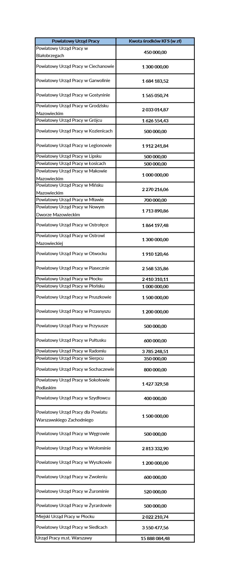 Zarząd Województwa Mazowieckiego, na podstawie propozycji Wojewódzkiego Urzędu Pracy w Warszawie, zatwierdził podział środków KFS pomiędzy powiatowe urzędy pracy w regionie. Wysokość przyznanych kwot była uzależniona m.in. od zgłaszanego zapotrzebowania lokalnych pracodawców, liczby osób pracujących w danym powiecie oraz stopnia wykorzystania środków KFS w poprzednich latach.