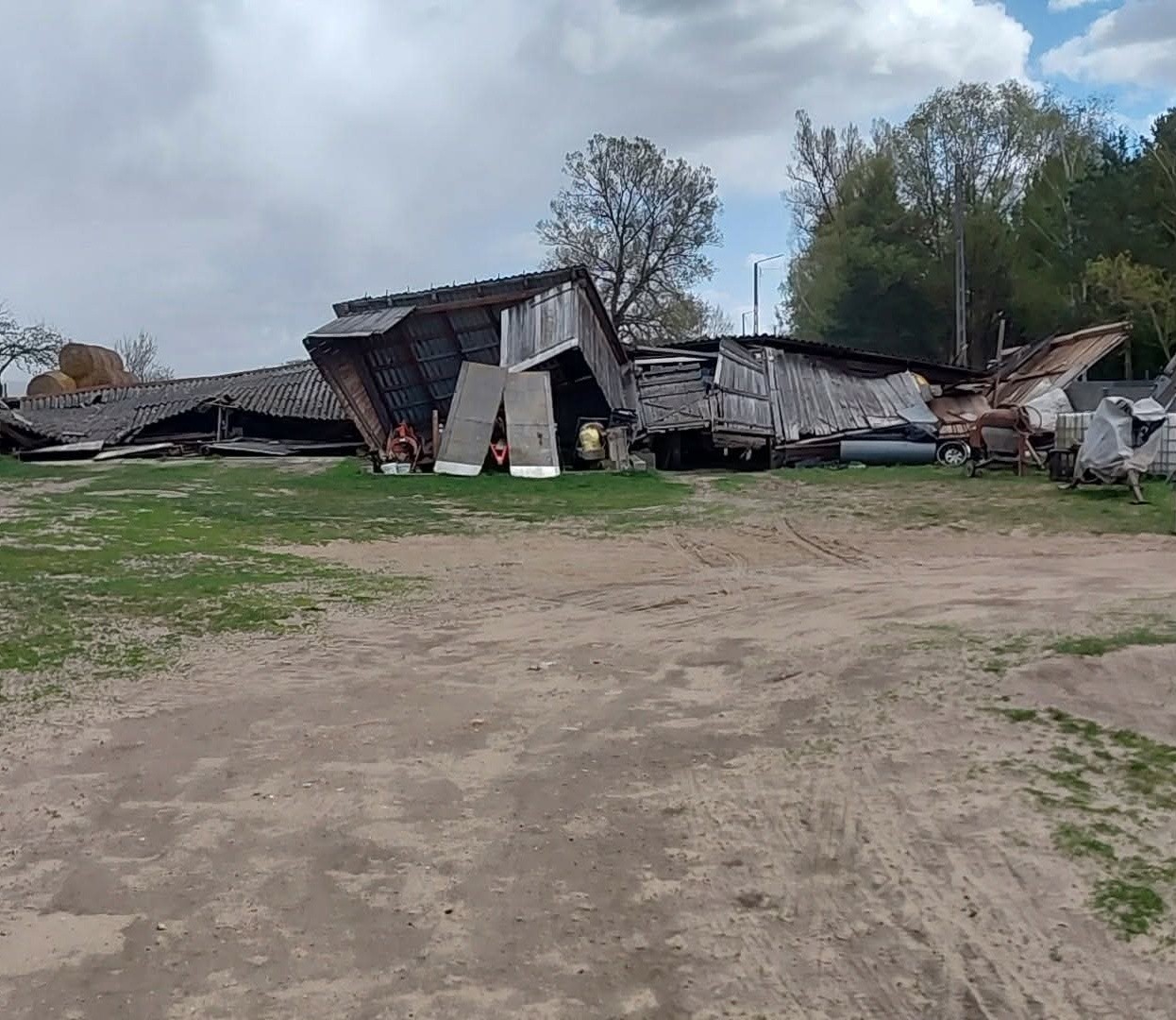 Zgłoszenie wpłynęło do służb o godzinie 13:27. Na miejscu okazało się, że drewniana stodoła nie wytrzymała naporu żywiołu. Konstrukcja została dosłownie złamana przez wiatr – dach i ściany runęły, grzebiąc pod sobą znajdujący się wewnątrz sprzęt rolniczy, w tym traktory.