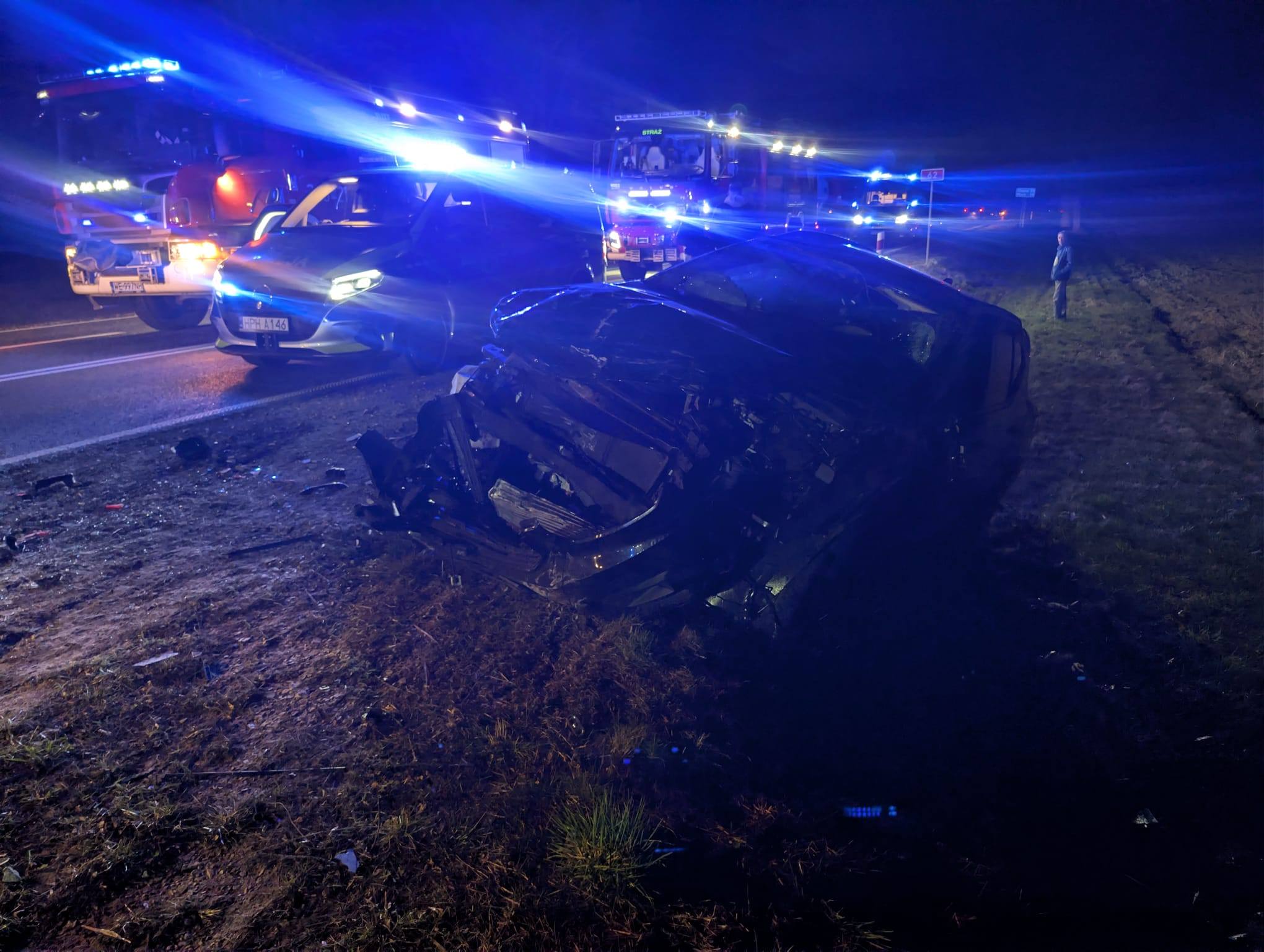 Na zdjęciu widać poważnie uszkodzony pojazd, co wskazuje na dużą siłę uderzenia. To kolejny przykład, jak niebezpieczne mogą być zdarzenia na drogach krajowych, gdzie często dochodzi do jazdy z większymi prędkościami.