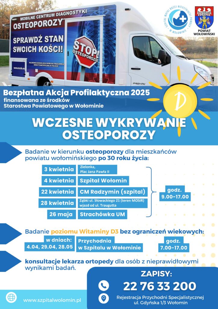 Mieszkańcy Powiatu Wołomińskiego mogą skorzystać z programu bezpłatnych badań w kierunku osteoporozy. Osoby z nieprawidłowymi wynikami będą mogły skorzystać z konsultacji ortopedy. Dodatkowo możliwe będzie zbadanie poziomu witaminy D3 w szpitalu w Wołominie.