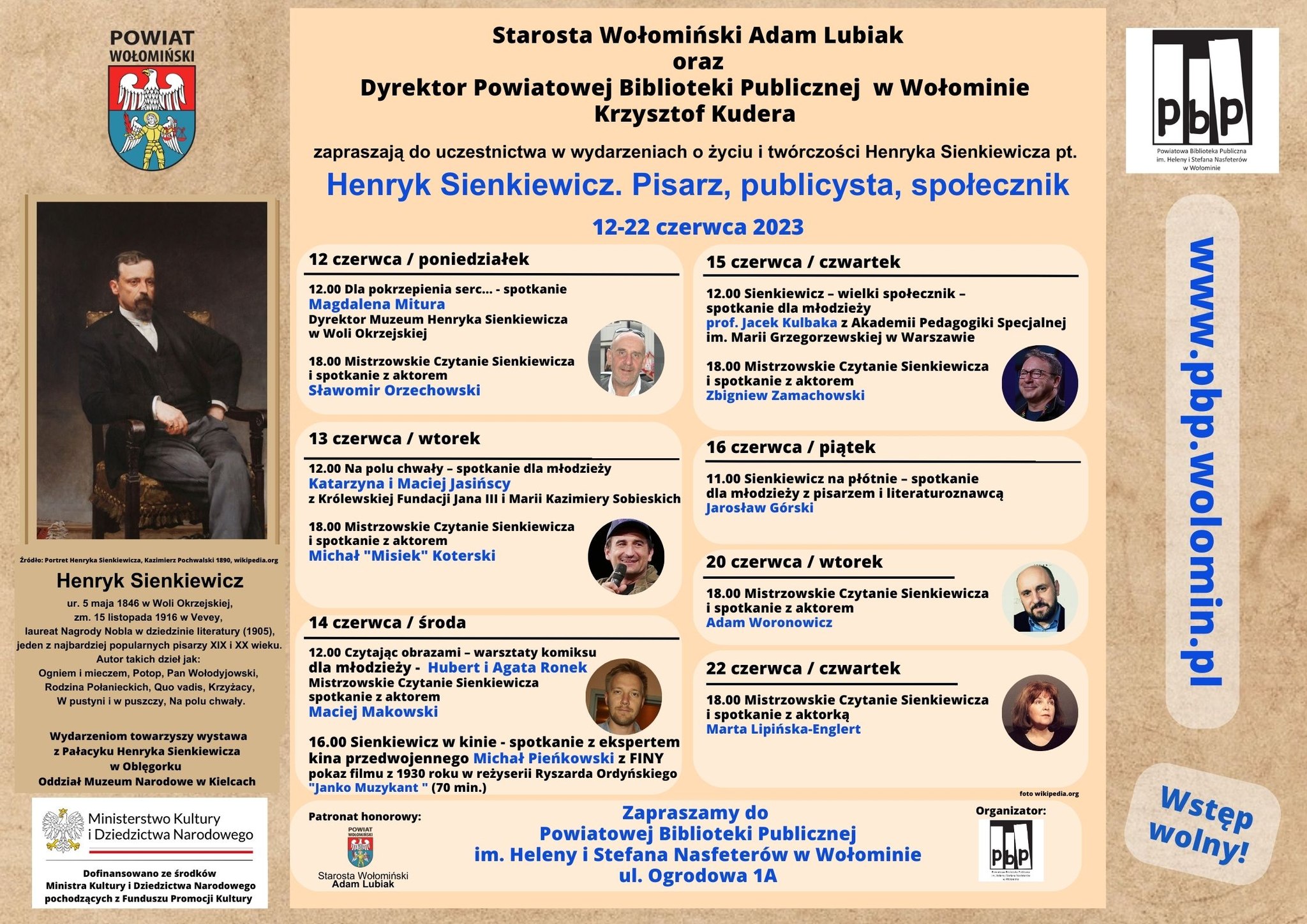 Zapraszam na organizowane przez Powiatową Bibliotekę Publiczną w Wołominie wydarzenia w dniach 12-22 czerwca 2023 r., o życiu i twórczości HENRYKA SIENKIEWICZA w ramach projektu pt.”Henryk Sienkiewicz. Pisarz, publicysta, społecznik”.