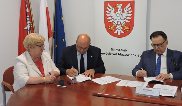 Zastępca Burmistrza Waldemar Banaszek przy kontrasygnacie Skarbnik Gminy Haliny Kusak podpisali umowę z Samorządem Województwa Mazowieckiego reprezentowanym przez Marszałka Województwa Mazowieckiego Adama Struzika oraz Dyrektora Departamentu Rolnictwa i Rozwoju Obszarów Wiejskich Radosława Rybickiego.