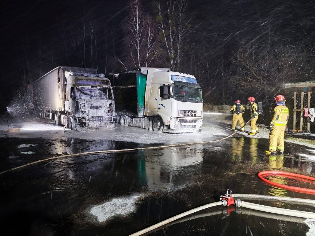 Pożar samochodu ciężarowego spowodowany zerwaną linią energetyczną