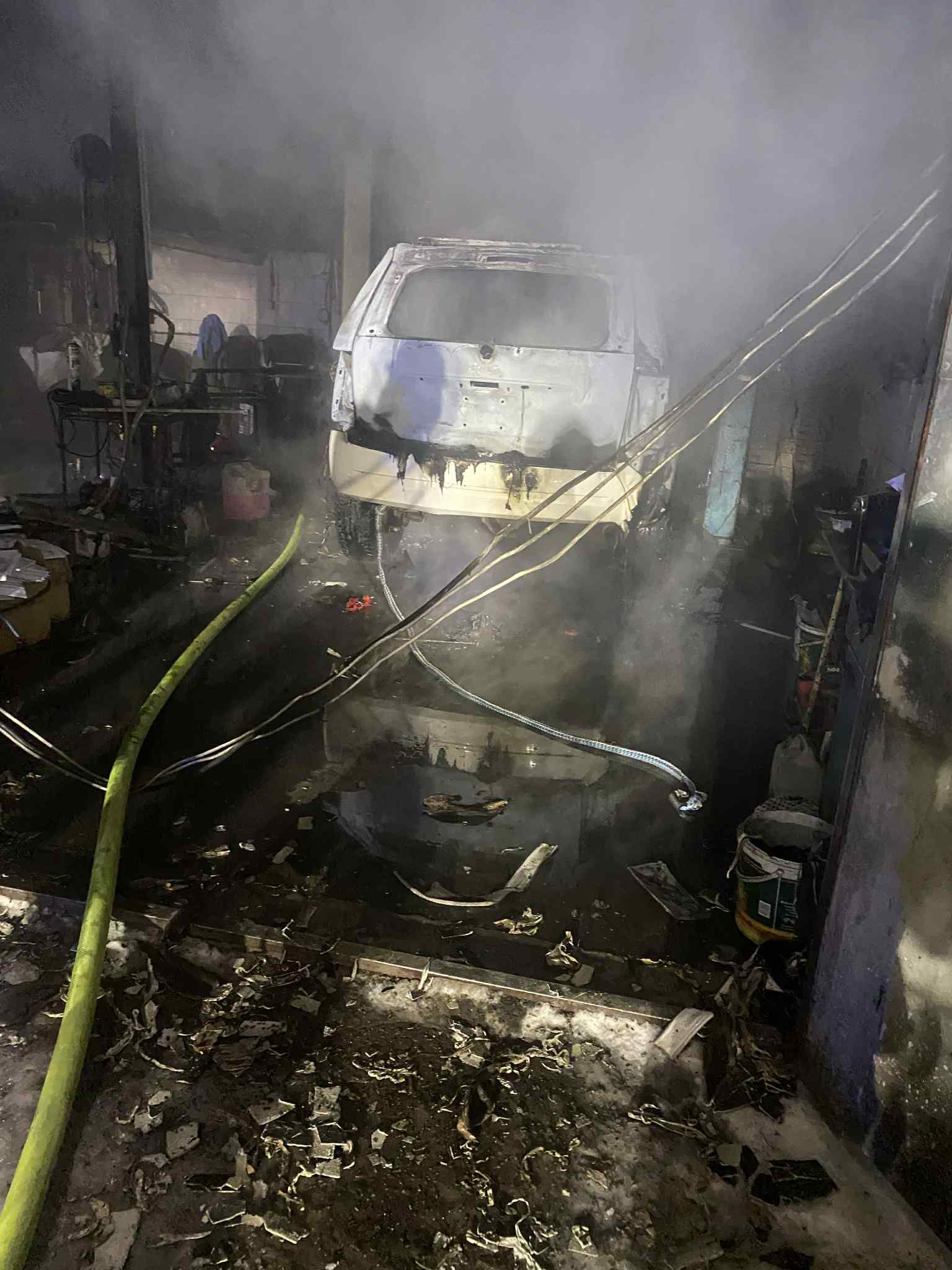 Po dotarciu pierwszych zastępów na miejsce zdarzenia sytuacja była bardzo niebezpieczna. Wnętrze warsztatu było silnie zadymione, a pojazd objęty pożarem nosił wyraźne ślady intensywnego oddziaływania wysokiej temperatury. Na obrazie z miejsca zdarzenia widoczny jest spalony tył samochodu, stopione elementy karoserii oraz zwisające, uszkodzone instalacje, co wskazuje na dynamiczny rozwój pożaru.
