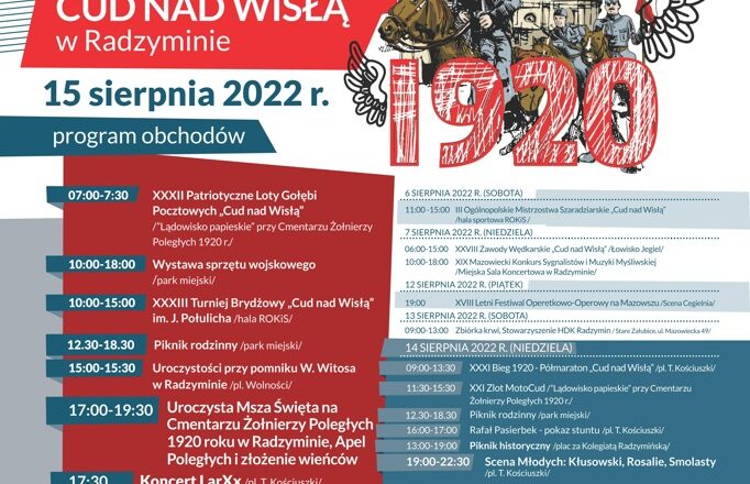 Gmina Radzymin wspólnie z zespołem organizatorów przygotowała bogaty program wydarzeń upamiętniających 102. rocznicę „Cudu nad Wisłą”. Świętowanie rozpoczniemy w Radzyminie już 6 sierpnia od Ogólnopolskich Mistrzostw Szaradziarskich „Cud nad Wisłą” na hali sportowej ROKiS, a zakończymy 21 sierpnia Turniejem Piłki Nożnej dla dzieci na Stadionie Miejskim RKS „Mazur”.