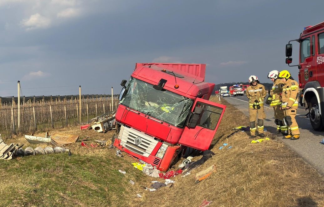 Koszmarny wypadek ciężarówki na DK50. Kierowca i pasażer wyrzuceni z kabiny.