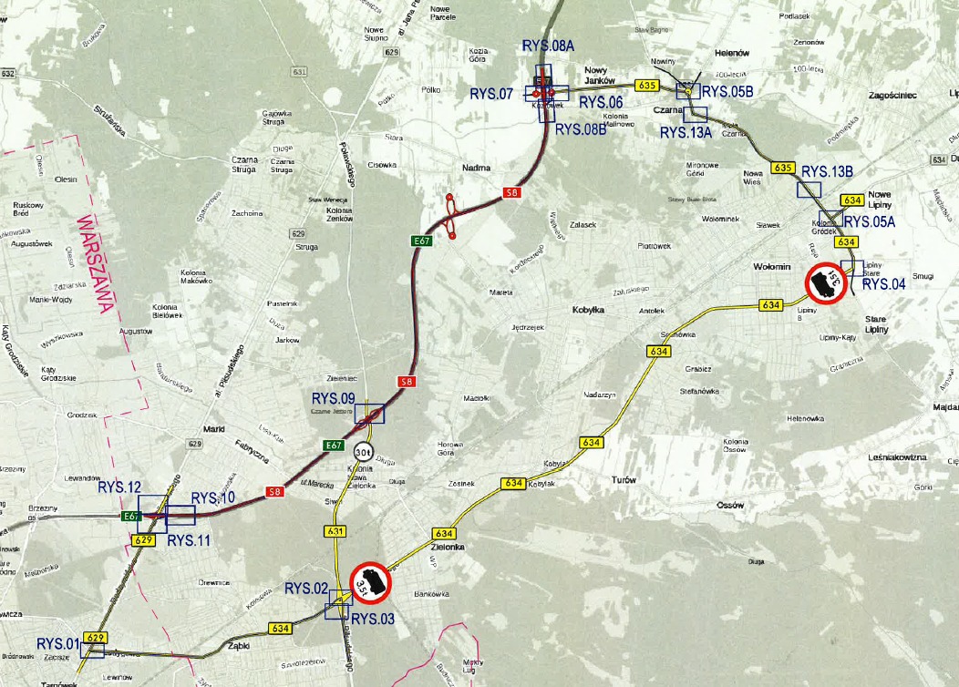 – Dla samochodów powyżej 30t objazd DW 634 w Ząbkach (ul. Ks. Skorupki) do DW 629 (ul. Radzymińska) dalej trasą S8 i drogą nr 635 na Wołomin.