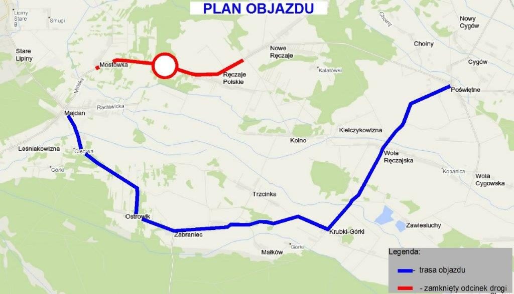 Starostwo wołomińskie informuje, że w dnu 28 października w związku z rozpoczęciem przebudowy drogi powiatowej nr 4314W na odcinku Majdan-Ręczaje Polskie, droga od miejscowości Mostówka w kierunku Ręczaj Polskich zostanie zamknięta dla ruchu pojazdów na okres ok. 5 tygodni. Zachęcamy do zapoznania się z planem objazdu i przepraszamy za wszelkie utrudnienia.