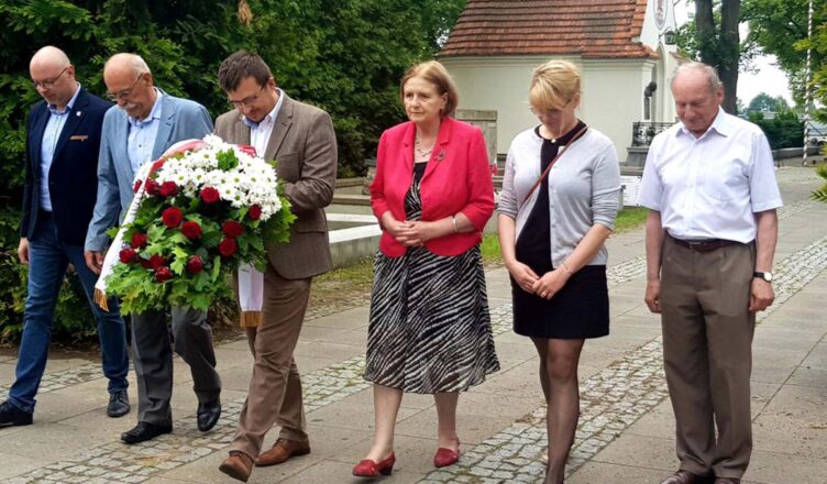 Goście wraz z gospodarzami – burmistrzem – Krzysztofem Chacińskim oraz zastępcą burmistrza – Krzysztofem Dobrzynieckim złożyli kwiaty na mogile bohaterów Bitwy Warszawskiej na Cmentarzu Żołnierzy Polskich 1920 roku, a następnie przeszli na plac budowy Muzeum Bitwy Warszawskiej, gdzie o inwestycji mówili Burmistrz – Krzysztof Chaciński i Kierownik Referatu Inwestycji – Anna Kurek.