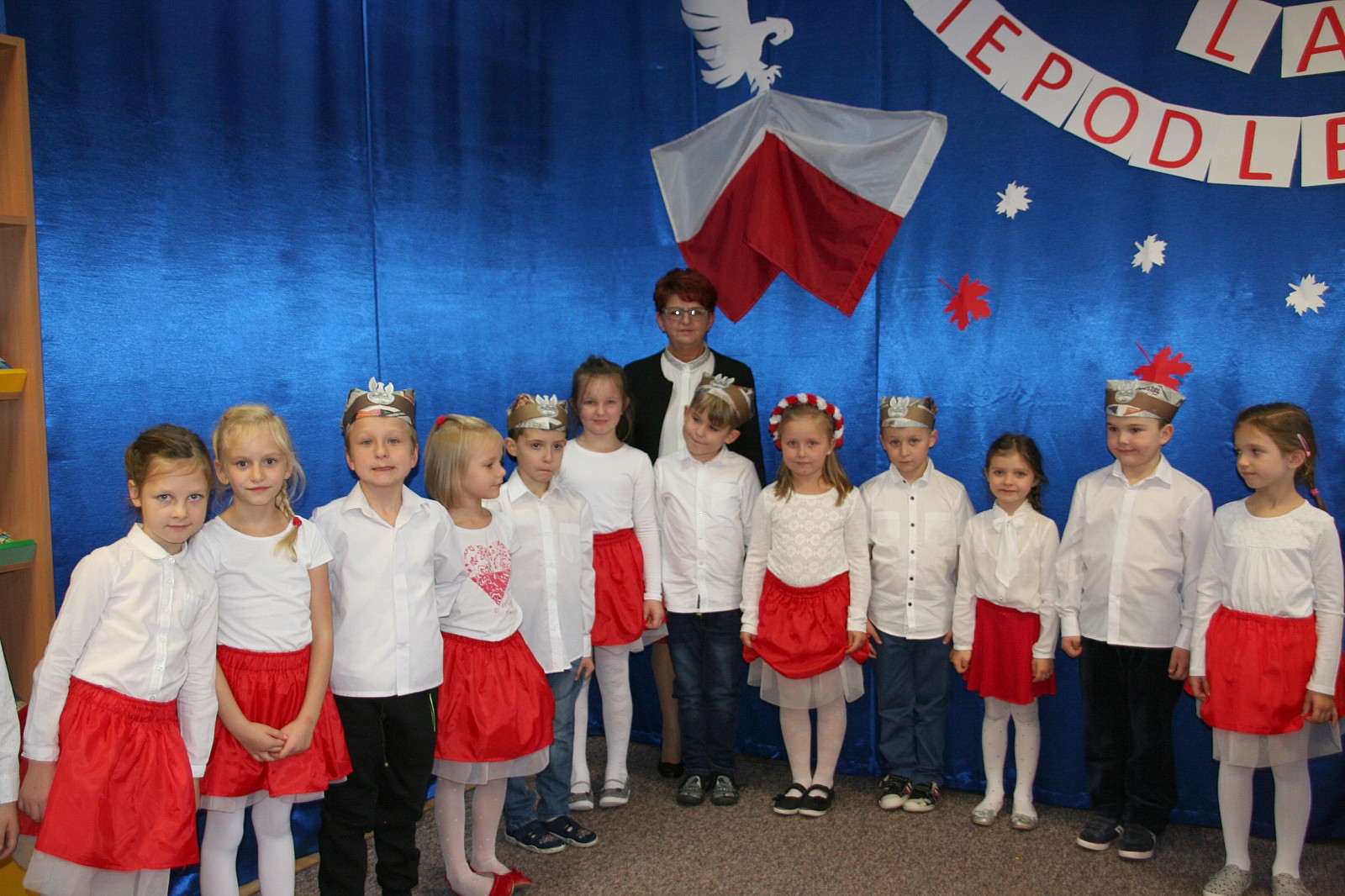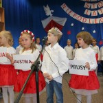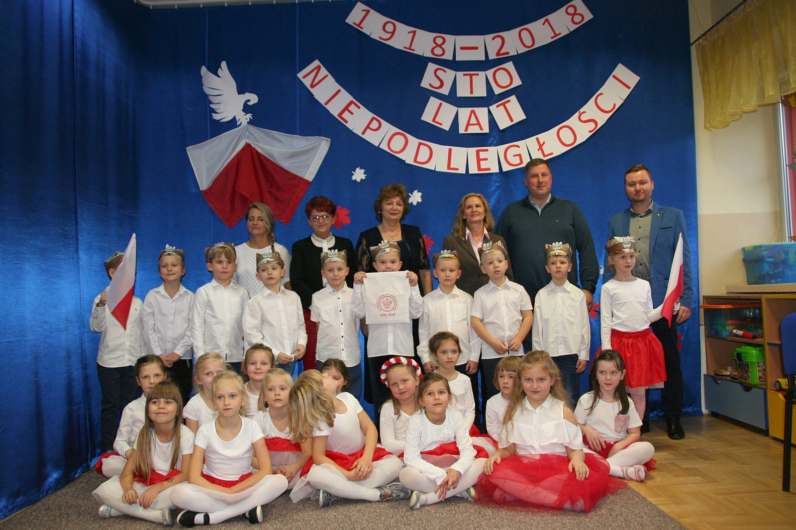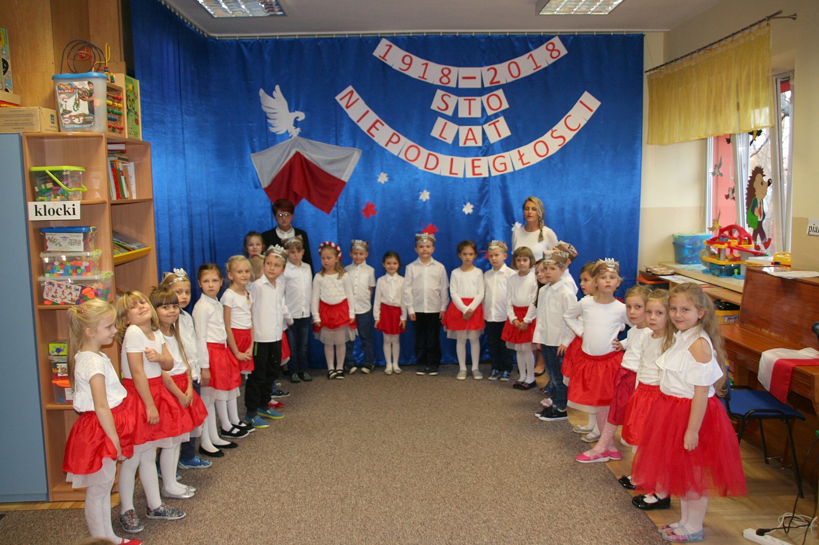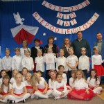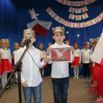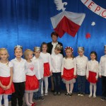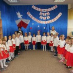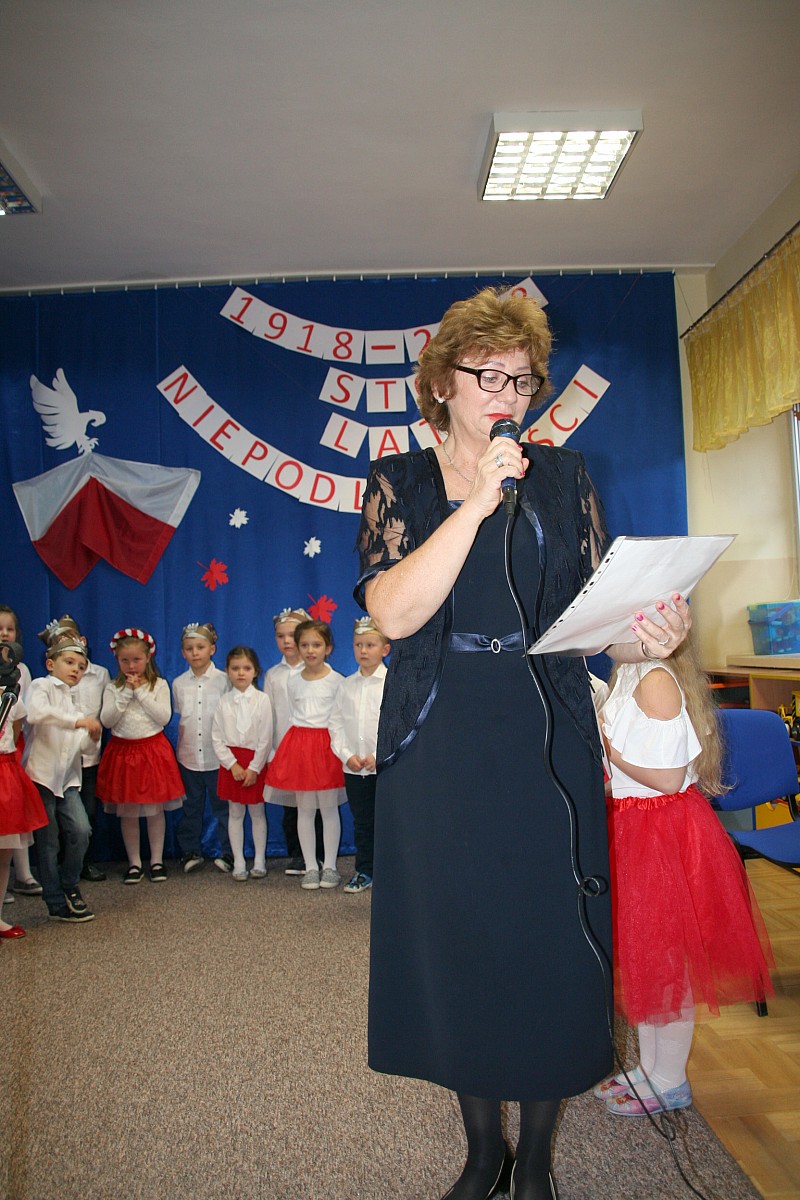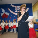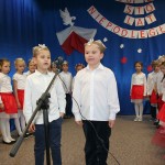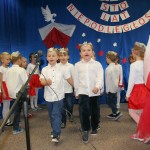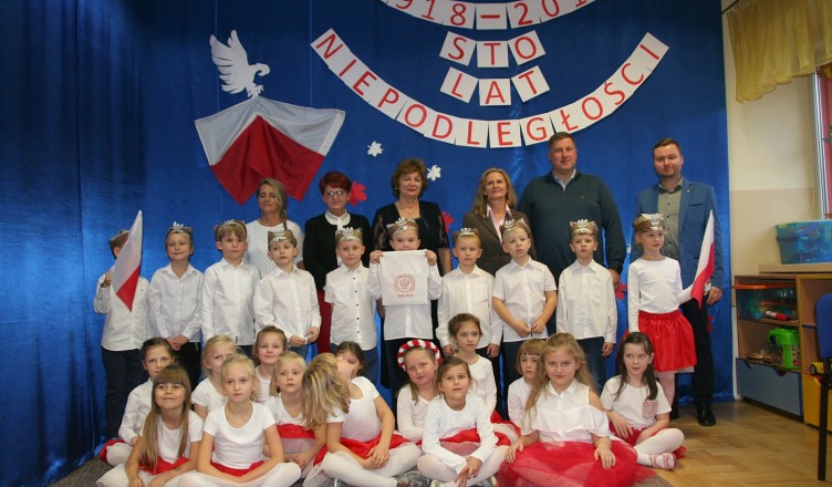 8 listopada o godzinie 15.00 od dostojnie odśpiewanego hymnu narodowego rozpoczął się występ przedszkolaków z najstarszej grupy „Pszczółki” Przedszkola Miejskiego Nr 1 „Wesoły Skrzat”. Mazurek Dąbrowskiego rozbrzmiewał w całej placówce, a najbardziej w sercach młodych patriotów, którzy w biało-czeronych strojach pięknie prezentowali sie na tle białego orła trzymającego narodową flagę. W przedszkolu od 5 lat realizowany jest autorski program patriotyczny prowadzony przez panią Dorotę Durkę. Kolejne pokolenia dzieci mają możliwość zapoznania się z historią naszego narodu, pieśniami patriotycznymi oraz symbolami narodowymi Polski. Swoją wiedzę i umiejętności demonstrują przed najwierniejszą publicznością składającą się z rodziców oraz dzieci z młodszych grup. W tym roku swoją obecnością na przedstawieniu zaszczycili nas burmistrz Jacek Orych oraz Paweł Pniewski – nowy radny okręgu, do którego przynależy nasze przedszkole. W krótkim przemówieniu pana burmistrza przedszkolaki usłyszały jak wspaniale prezentują postawę patriotyczną w naszym mieście. W dowód uznania została wręczona na ręce pani dyrektor Hanny Dąbrowskiej jubileuszowa flaga narodowa przygotowana przez parę prezydencką. Do flagi dołączony został apel prezydenta Andrzeja Dudy: „aby wszyscy Polacy wywiesili flagi państwowe 11 listopada; aby się pod nimi zgromadzili i o godzinie 12.00 odśpiewali hymn narodowy”.
