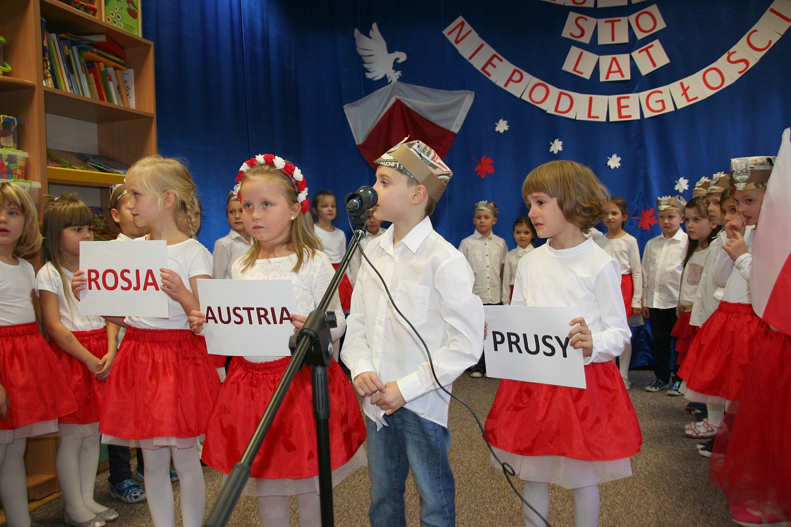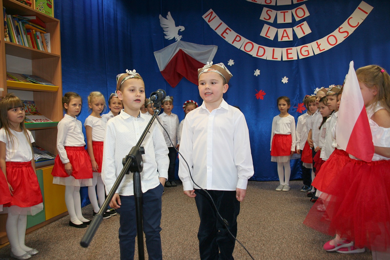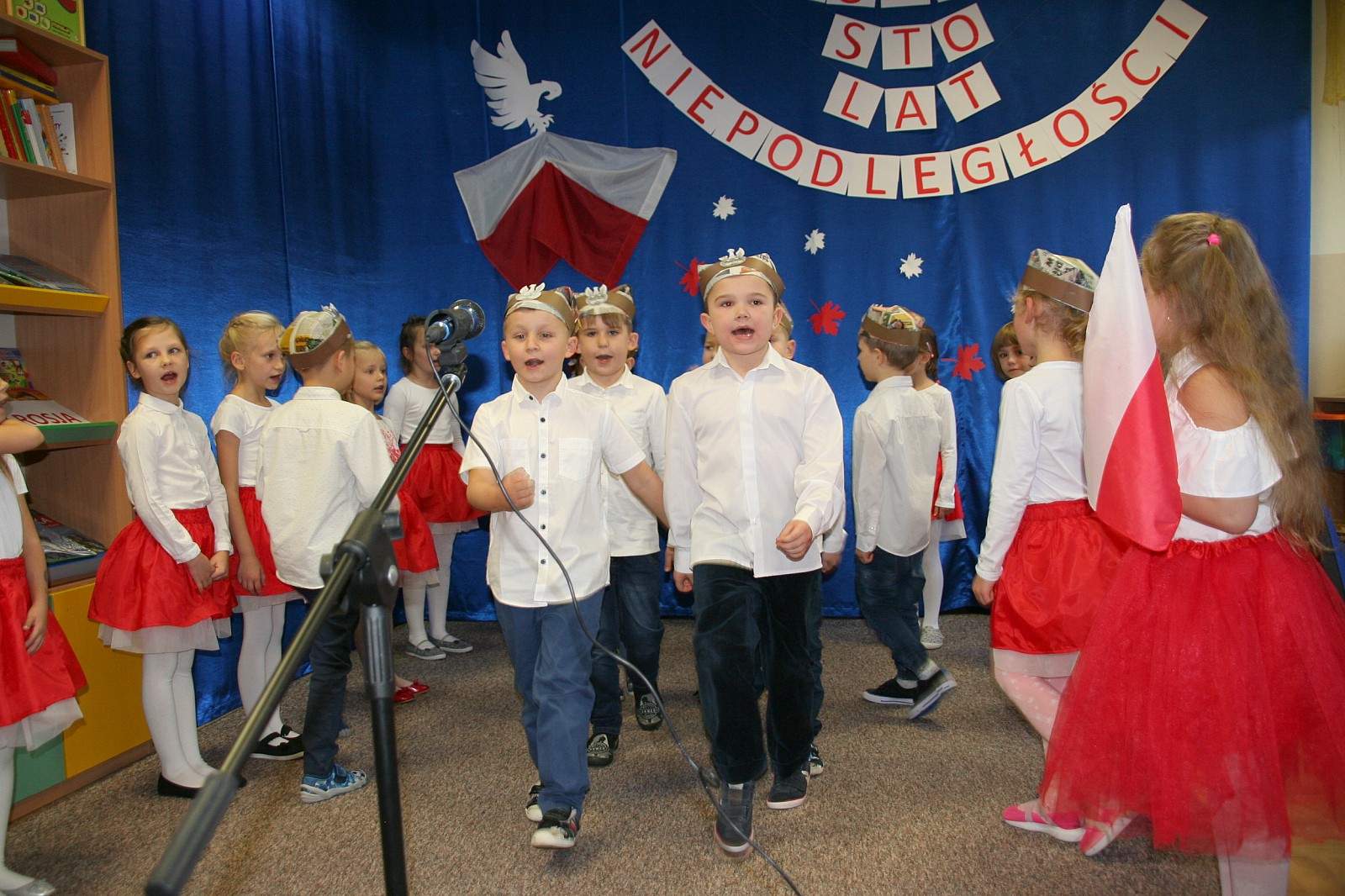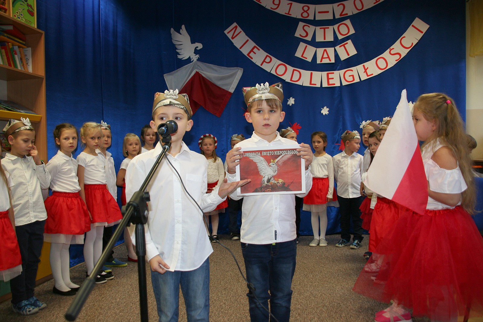 8 listopada o godzinie 15.00 od dostojnie odśpiewanego hymnu narodowego rozpoczął się występ przedszkolaków z najstarszej grupy „Pszczółki” Przedszkola Miejskiego Nr 1 „Wesoły Skrzat”. Mazurek Dąbrowskiego rozbrzmiewał w całej placówce, a najbardziej w sercach młodych patriotów, którzy w biało-czeronych strojach pięknie prezentowali sie na tle białego orła trzymającego narodową flagę. W przedszkolu od 5 lat realizowany jest autorski program patriotyczny prowadzony przez panią Dorotę Durkę. Kolejne pokolenia dzieci mają możliwość zapoznania się z historią naszego narodu, pieśniami patriotycznymi oraz symbolami narodowymi Polski. Swoją wiedzę i umiejętności demonstrują przed najwierniejszą publicznością składającą się z rodziców oraz dzieci z młodszych grup. W tym roku swoją obecnością na przedstawieniu zaszczycili nas burmistrz Jacek Orych oraz Paweł Pniewski – nowy radny okręgu, do którego przynależy nasze przedszkole. W krótkim przemówieniu pana burmistrza przedszkolaki usłyszały jak wspaniale prezentują postawę patriotyczną w naszym mieście. W dowód uznania została wręczona na ręce pani dyrektor Hanny Dąbrowskiej jubileuszowa flaga narodowa przygotowana przez parę prezydencką. Do flagi dołączony został apel prezydenta Andrzeja Dudy: „aby wszyscy Polacy wywiesili flagi państwowe 11 listopada; aby się pod nimi zgromadzili i o godzinie 12.00 odśpiewali hymn narodowy”.