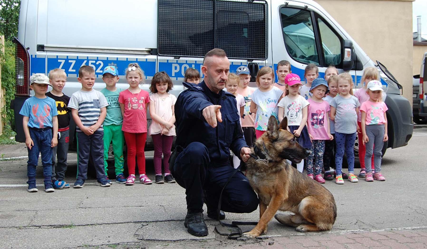 Na początek pięcio i sześciolatki spotkały się z policyjnym psem. Policjant przewodnik mł. asp. Rober Szydeł wraz ze swoim służbowym psem ?KARO? zaprezentował umiejętności swojego podopiecznego, oraz opowiedział dzieciom do czego w Policji mogą służyć psy. Zdjęcie z policyjnym psem to też ?fajna? pamiątka.