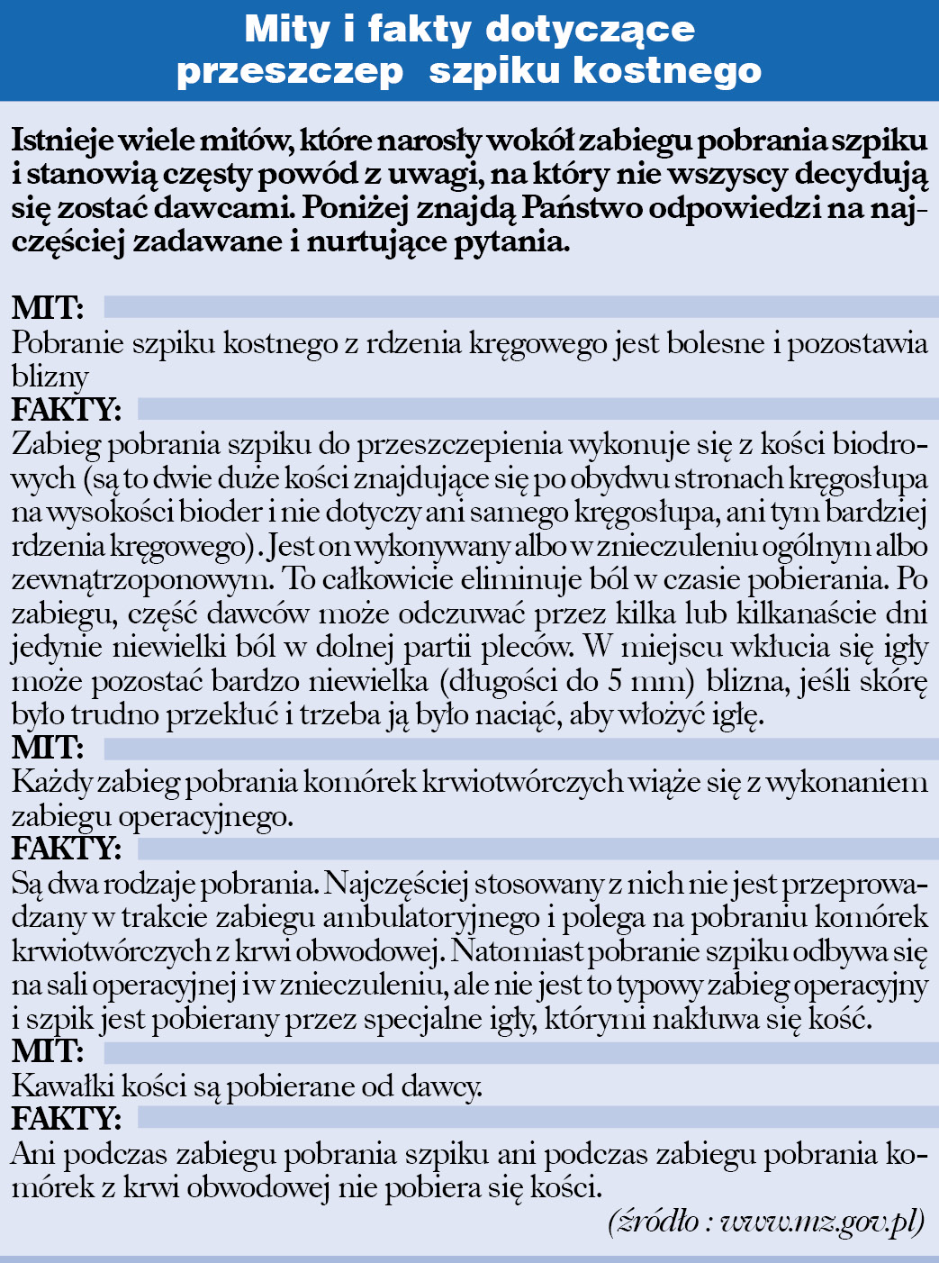 Rocznie odnotowuje się ok. 10 tyś. zachorowań na nowotwory krwi ?Białaczki?. Jedną z metod leczenia jest przeszczep szpiku kostnego. Dzięki szybkiemu rozwojowi medycyny w dziedzinie transplantologii, leczenie poprzez przeszczep szpiku stało się powszechnie uznaną metodą leczenia tych chorób.Wyróżniamy trzy rodzaje przeszczepów: transplantację autologiczną – polegającą na pobraniu, przechowaniu i następowym przeszczepieniu własnego odpowiednio przygotowanego szpiku. Czyni się to dla osłony komórek krwiotwórczych w czasie chemioterapii transplantację izogeniczną – polegającą na przeniesieniu szpiku między osobnikami identycznymi genetycznie np. pomiędzy bliźniętami jednojajowymi ? transplantację allogeniczną – polegającą na przeniesieniu szpiku od dawcy różnego genetycznie od biorcy, ale dobranego pod względem cech decydujących o powodzeniu zabiegu tj. pod względem HLA (human leukocyte antigens – antygenów zgodności tkankowej).