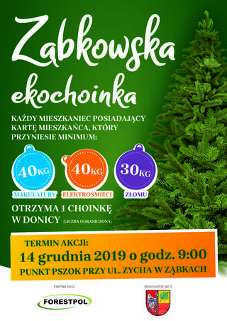Burmistrz Ząbek Małgorzata Zyśk zaprasza na świąteczną akcję choinkową 14 grudnia br. w sobotę do punktu PSZOK, przy ul. Zycha w Ząbkach. Akcja będzie trwała od godz. 9:00 do czasu rozdania wszystkich choinek i ma na celu zwiększyć świadomość ekologiczną mieszkańców.
