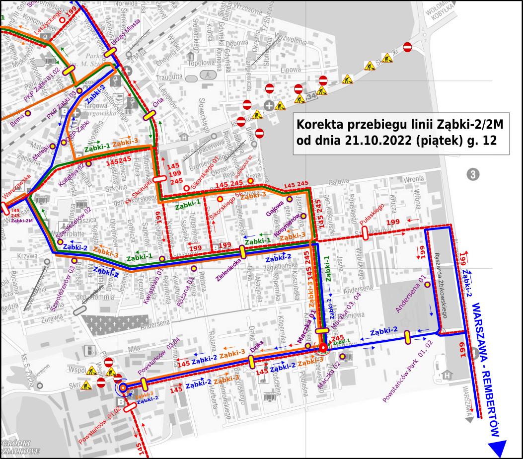 Autobusy wracające z Rembertowa pojadą ul. Żbikowskiego, przez rondo Ekologii i całą długością ul. Powstańców. W związku z tym od 21.10 od godziny 12:00 zawiesza się dla linii Ząbki-2/2M funkcjonowanie przystanku Pułaskiego 01 na ul. Szwoleżerów.