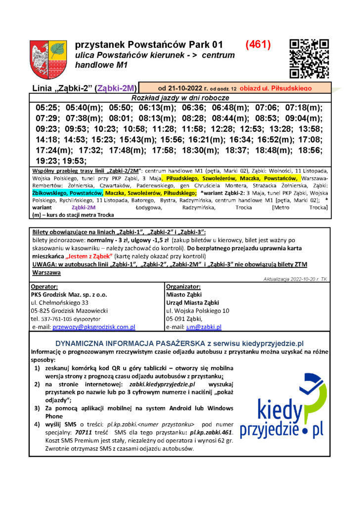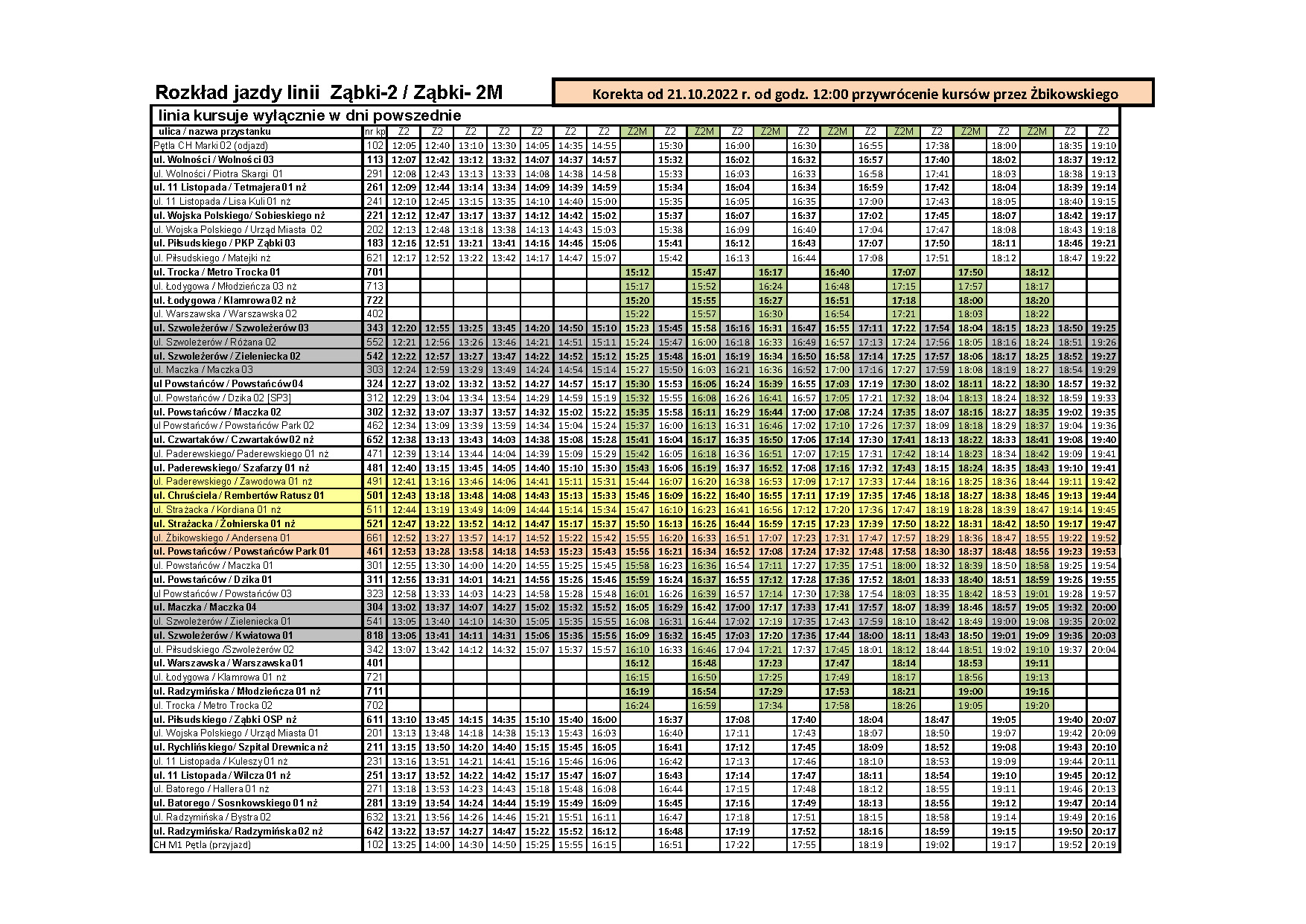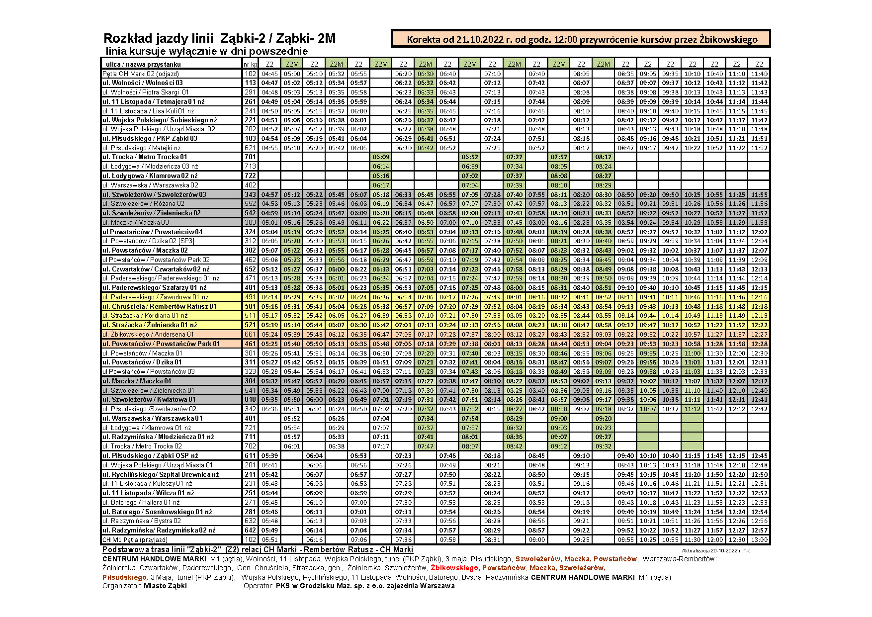 W związku z powyższym wprowadza się korektę rozkładu linii Ząbki-2/2M dla zmienionego odcinka trasy. Tabliczki rozkładowe na pozostałych przystankach z datą ważności ważne od 01.09 i później korygowane nadal obowiązują.