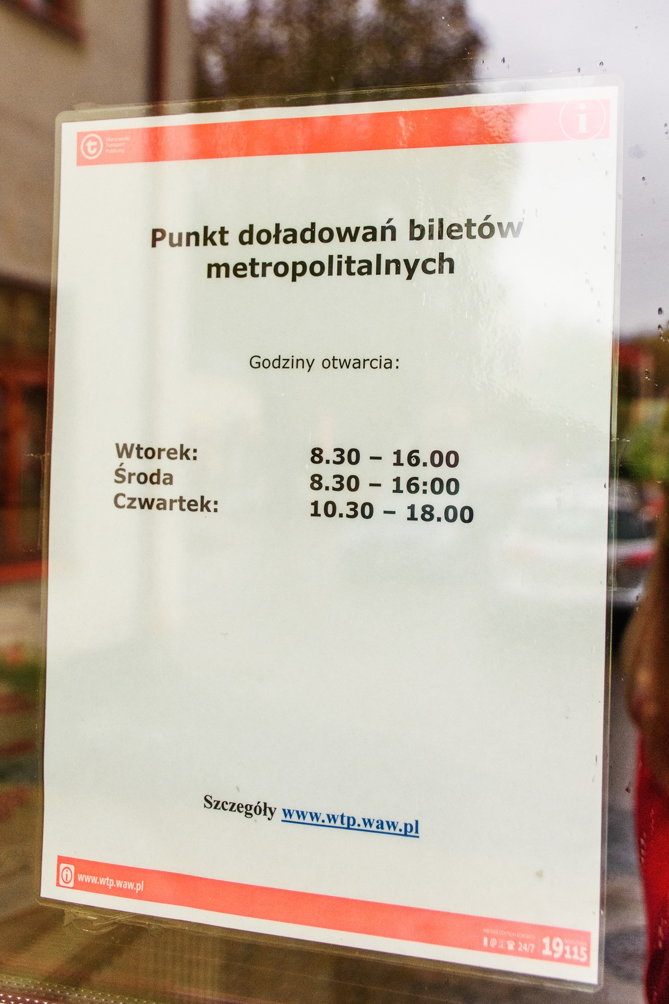 Na miejscu można doładować kartę z zakodowanym Biletem Metropolitalnym (Warszawa+) z dopłatą gminy na I i II strefę. Przyjmowane będą wyłącznie płatności bezgotówkowe.