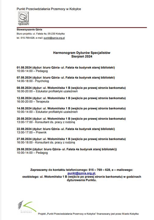 Punkt Przeciwdziałania Przemocy w Kobyłce, prowadzony przez Stowarzyszenie Qźnia, przygotował na sierpień 2024 roku harmonogram dyżurów specjalistów. Mieszkańcy mogą liczyć na wsparcie pedagogów, psychologów, terapeutów oraz edukatorów profilaktyki uzależnień.