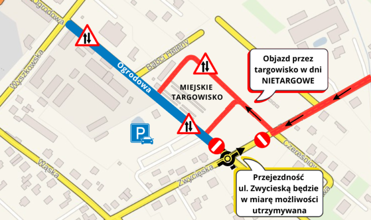 W dni nietargowe (czyli poza środą i sobotą) ruch z ulicy Zwycięskiej od strony Starego Dybowa będzie prowadzony objazdem przez targowisko do ulicy Ogrodowej w stronę Wyszkowskiej.