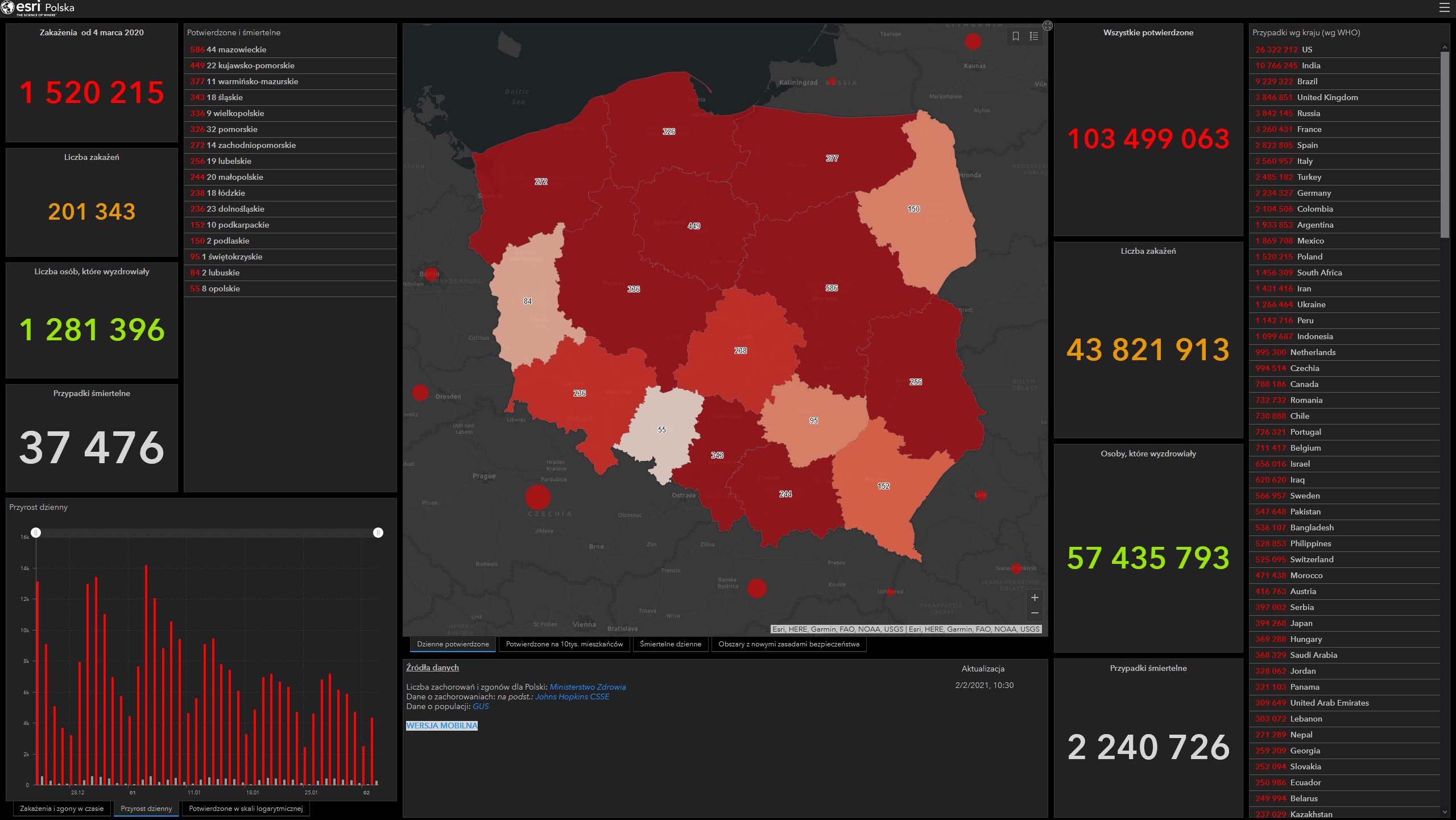 - Dzienna liczba zakażonych = liczba osób z pozytywnym wynikiem zaraportowanych przez laboratoria do systemu EWP w ciągu ostatniej doby (osoby z unikalnym numerem PESEL)