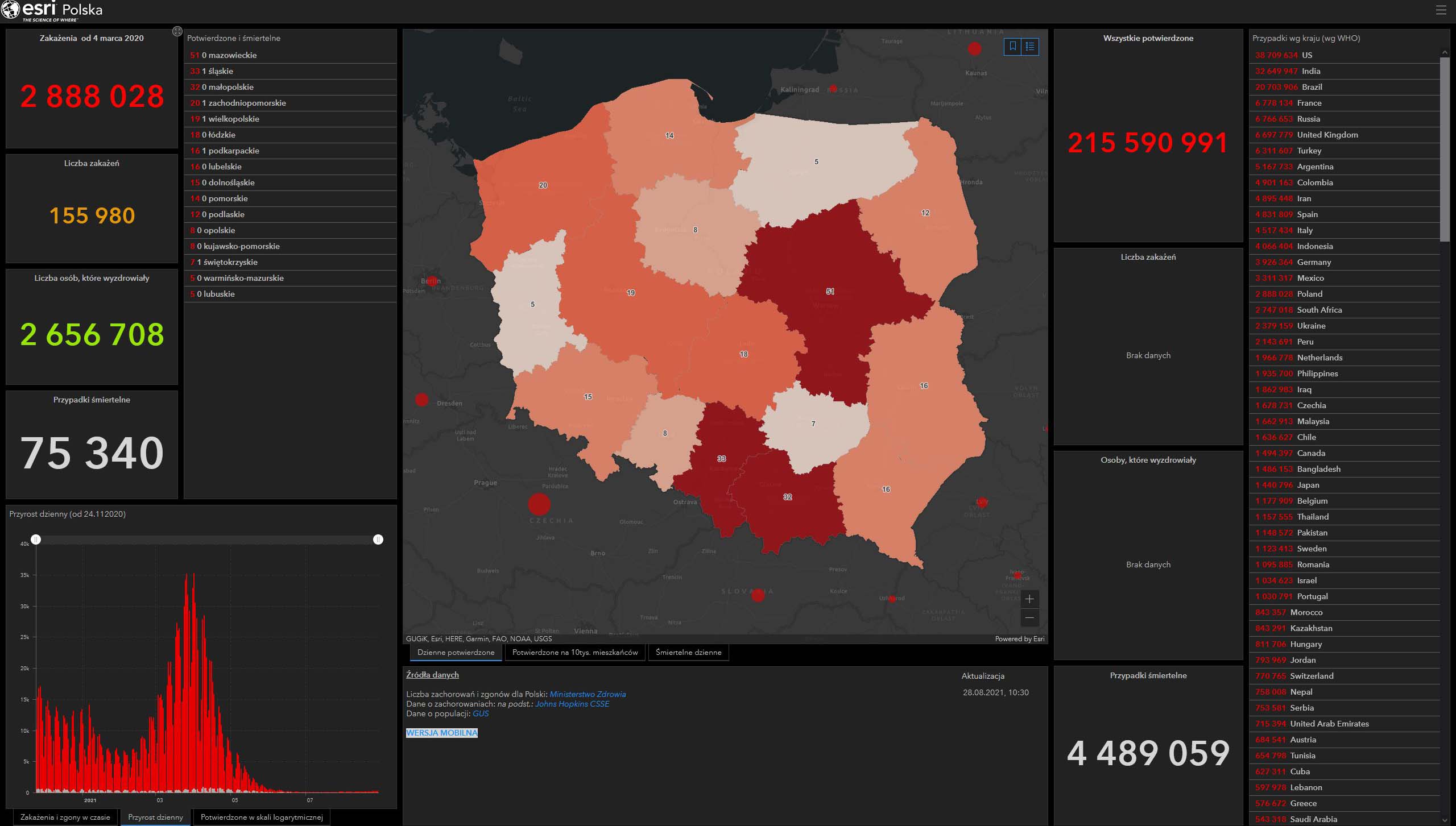 - Dzienna liczba zakażonych = liczba osób z pozytywnym wynikiem zaraportowanych przez laboratoria do systemu EWP w ciągu ostatniej doby (osoby z unikalnym numerem PESEL)