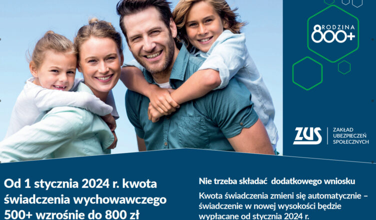 Od 1 stycznia 2024 r. kwota świadczenia wychowawczego zostanie podniesiona z 500 zł do 800 zł. ZUS, który wypłaca to świadczenie, sam zmieni jego wysokość. Dlatego nie trzeba składać dodatkowego wniosku. Wypłaty świadczeń w nowej wysokości będą realizowane od stycznia 2024 r. Podniesienie kwoty świadczenia do 800 zł od 1 stycznia 2024r.