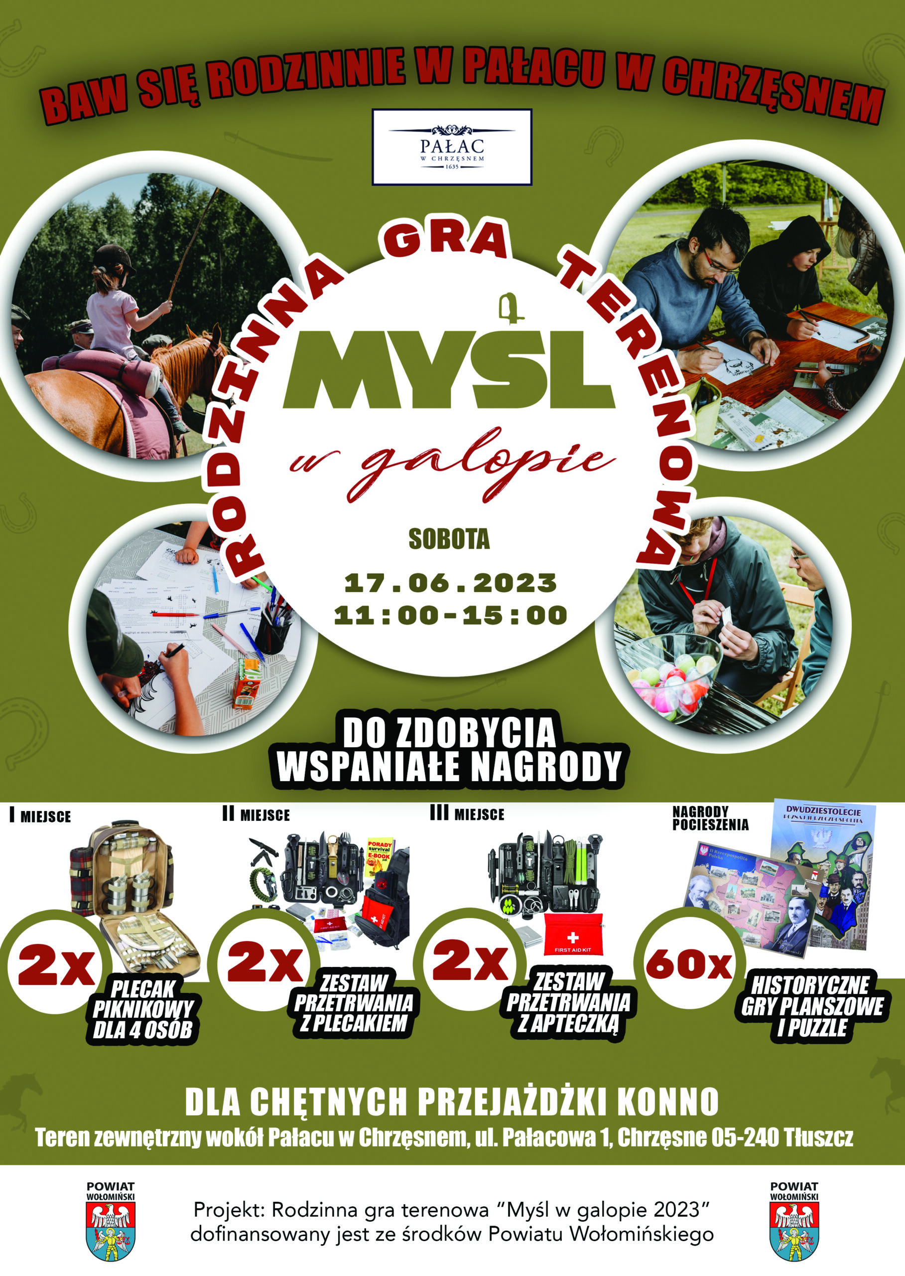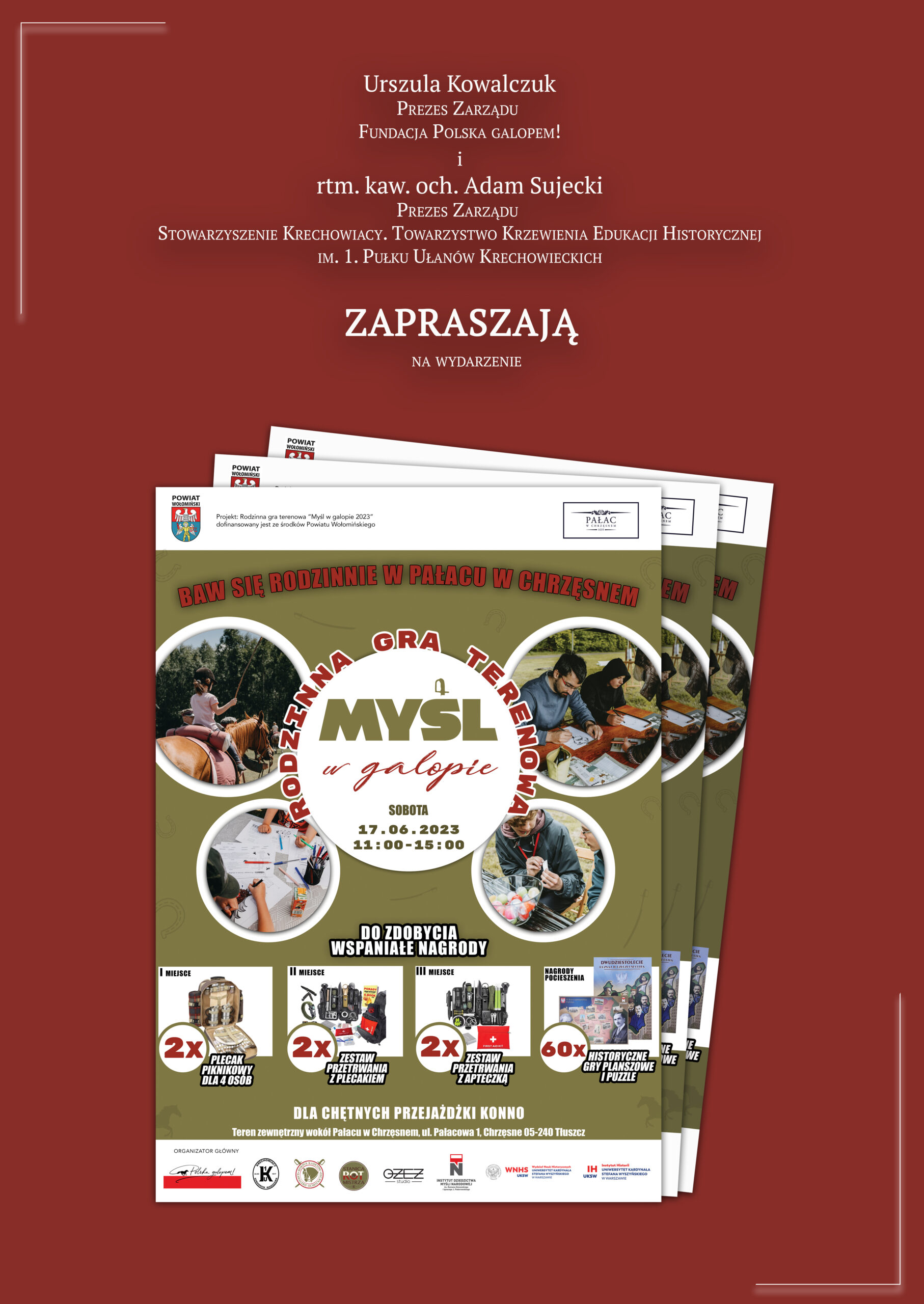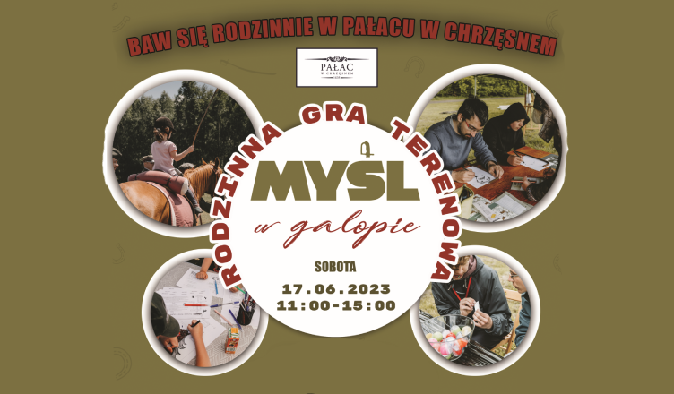 W sobotę 17.06.2023 w Pałacu w Chrzęsnem cała rodzina (lub zespół przyjaciół) może wystartować w Rodzinnej grze terenowej Myśl w galopie! Do zdobycia wspaniałe nagrody, które przydadzą się podczas wakacyjnych wyjazdów, aż dla 6 zespołów. Dodatkowo – nagrody pocieszenia gry i puzzle – ufundowane przez Instytut Dziedzictwa Myśli Narodowej im. Romana Dmowskiego i Ignacego Jana Paderewskiego.