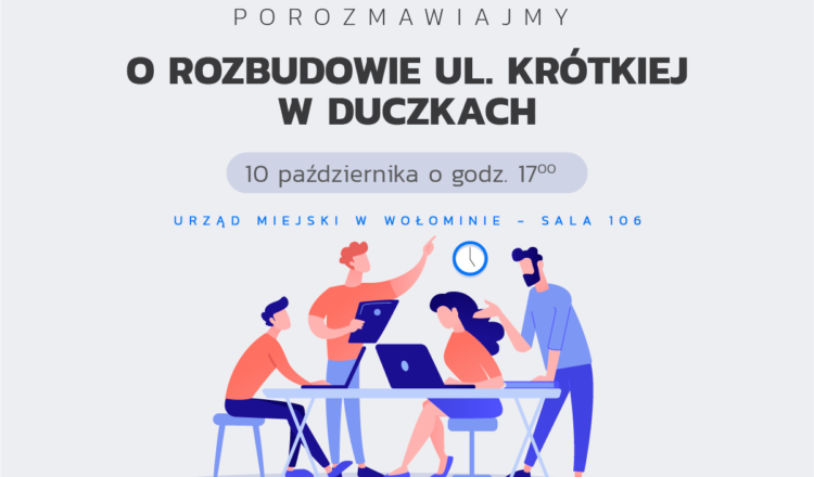 Rozpoczyna się ważna inwestycję dla  gminy Wołomin  – rozbudowa ul. Krótkiej w Duczkach. – Zapraszamy wszystkich zainteresowanych mieszkańców do udziału w spotkaniu na temat rozbudowy ul. Krótkiej w Duczkach na odcinku od ul. Willowej do wysokości rzeki Czarna, które odbędzie się 10 października o godz. 17:00 w sali 106 Urzędu Miejskiego w Wołominie – zachęca ratusz