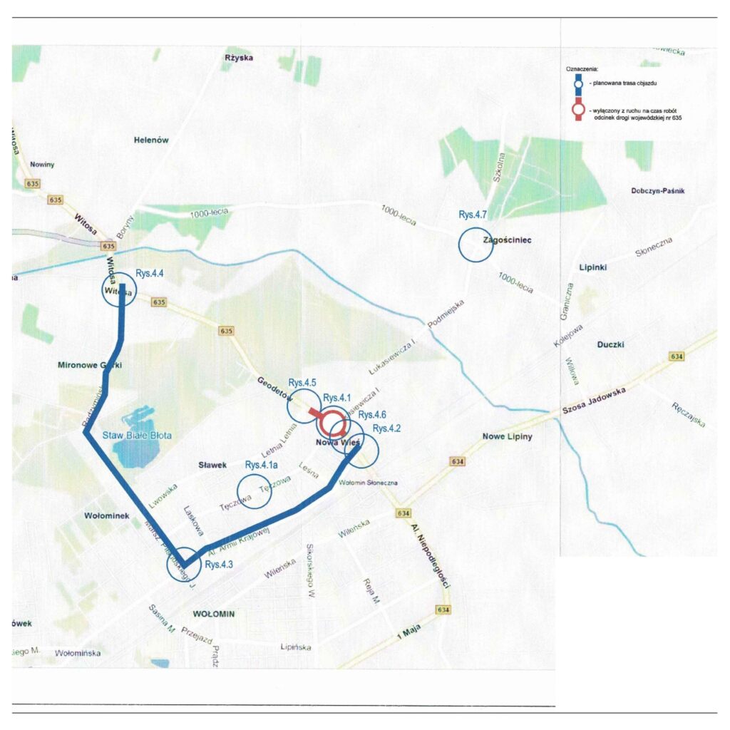 W dniu dzisiejszym na oficjalnej stronie FBkowej UM Wołomin pojawiła się informacja zapowiadająca rozpoczęcie prac. „Zgodnie z informacjami przedstawionymi przez wykonawcę prac budowlanych informujemy, że w dn. 5 września 2022 roku w związku z planowaną rozbudową nastąpi wprowadzenie czasowej organizacji ruchu dla drogi wojewódzkiej nr 635 (ul. Geodetów w Wołominie) na odcinku od ul. Nowa Wieś do ul. Łukasiewicza/Głowackiego. Inwestycja prowadzona jest przez Mazowiecki Zarząd Dróg Wojewódzkich w Warszawie. Kierowców prosimy o zapoznanie się ze schematem objazdu Prosimy o zachowanie szczególnej ostrożności przy poruszaniu się w okolicy placu budowy i zwracanie uwagi na znaki. Przewidywany czas obowiązywania czasowej organizacji ruchu to II półrocze 2023 roku” – czytamy na FB Wołomina. Mapa przekazana przez wykonawcę prac