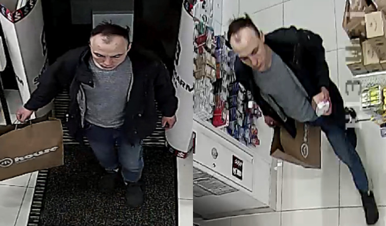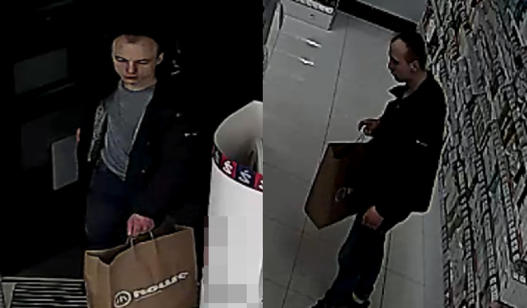 Mężczyzna jest w wieku około 25 lat, ma około 175 cm wzrostu, szczupłą budowę ciała, ciemne włosy z zakolami; ubrany był w czarną kurtkę, szarą koszulkę, spodnie jeansowe, buty sportowe w kolorze czarnym, posiadał papierową torbę na zakupy z logo firmy ”House”.