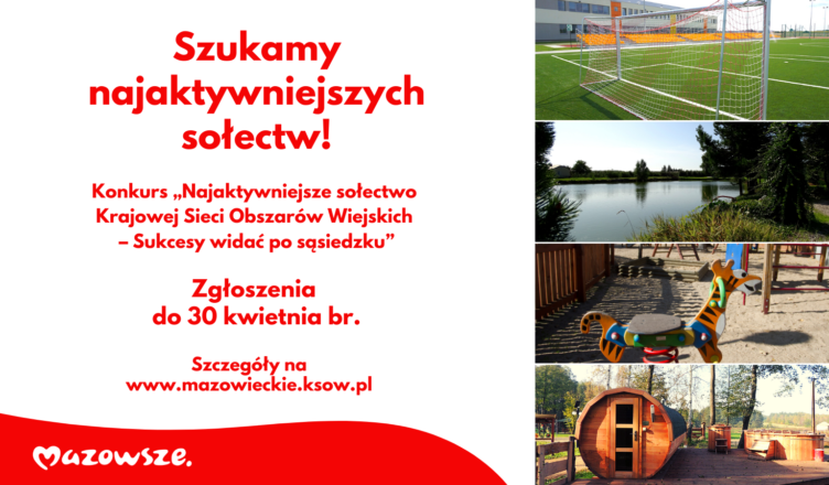 Mazowieckie sołectwa mogą wziąć udział w konkursie ?Najaktywniejsze sołectwo Krajowej Sieci Obszarów Wiejskich ? Sukcesy widać po sąsiedzku?. Pula nagród wynosi 30 tys. zł. Zgłoszenia są przyjmowane do 30 kwietnia.