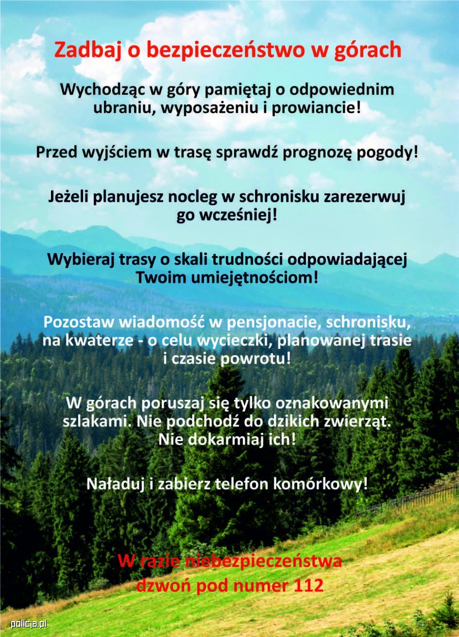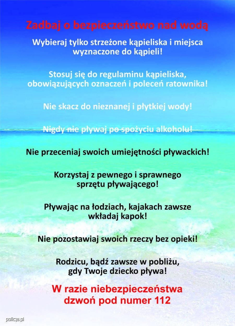 Wielu z nas także skorzysta z aktywności fizycznej i czas wakacyjny spędzi nad wodą. Nie pozwólmy jednak na to, aby zbytnia beztroska sprawiła, że zapomnimy o bezpieczeństwie swoim i naszych bliskich. Chwila nieuwagi może skończyć się tragicznie. Pamiętajmy, że to my sami, w pierwszej kolejności, odpowiedzialni jesteśmy za bezpieczeństwo swoje i innych.