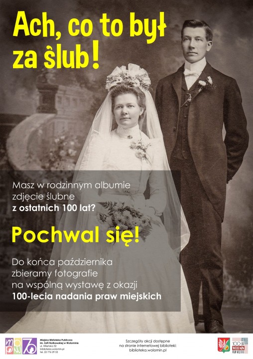 Miejska Biblioteka Publiczna im. Zofii Nałkowskiej w Wołominie (ul. Wileńska 32) do końca października zbiera fotografie ślubne ? stare i nowe. Zebrane zdjęcia posłużą do przygotowania wystawy zorganizowanej z okazji 100-lecia nadania praw miejskich.