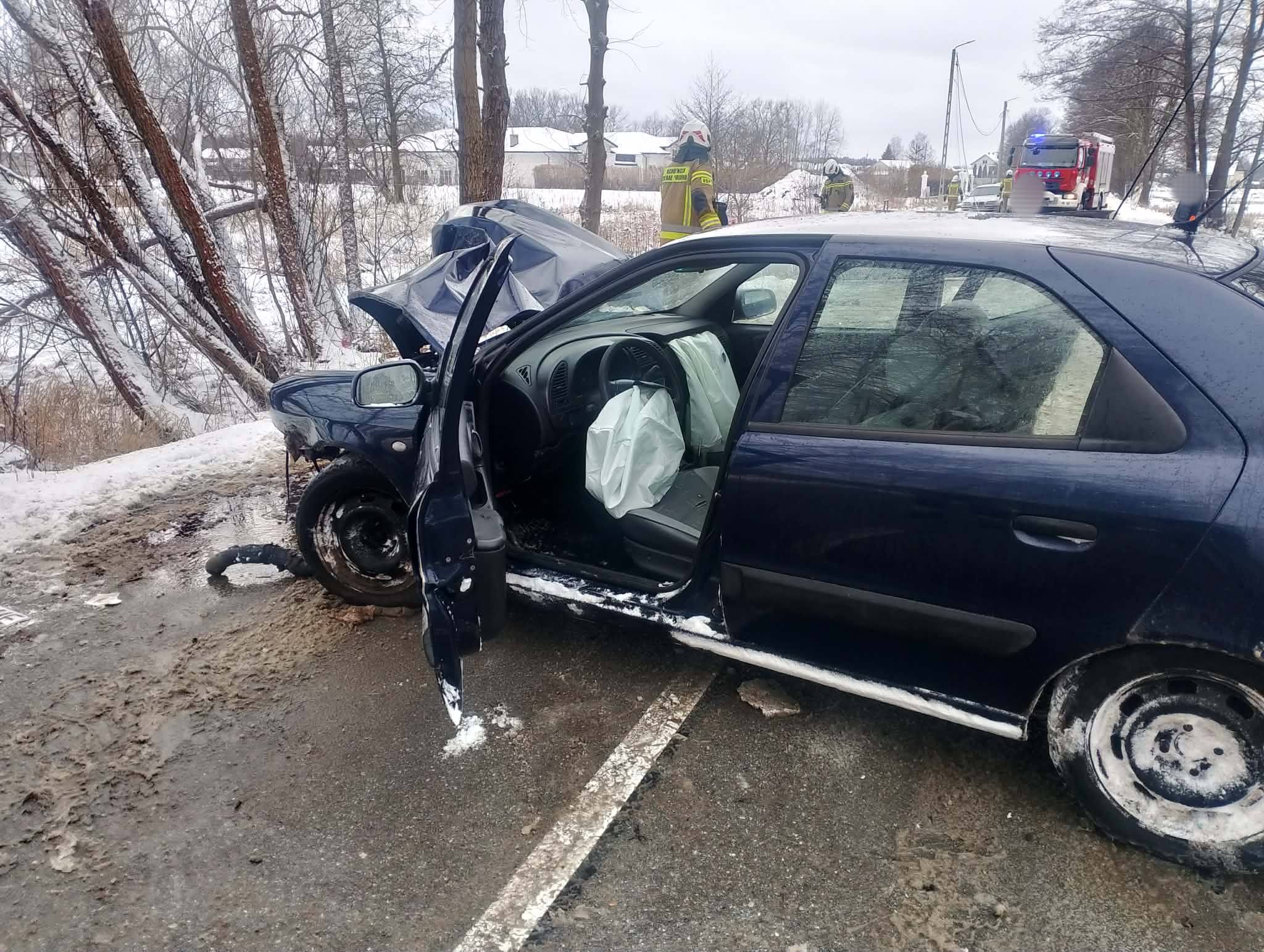 Po przybyciu pierwszych zastępów na miejsce zdarzenia stwierdzono, że pojazd z dużą siłą uderzył w przydrożny słup, który w wyniku kolizji został złamany i przewrócił się na jezdnię, blokując przejazd. Samochód uległ znacznym uszkodzeniom przodu, a na drodze widoczne były elementy karoserii oraz wycieki płynów eksploatacyjnych. Zdarzenie miało miejsce w zimowych warunkach, na śliskiej i miejscami oblodzonej nawierzchni, co mogło mieć wpływ na utratę panowania nad pojazdem.