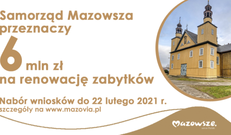 Od poniedziałku będzie można ubiegać się o dotację na prace konserwatorskie, restauratorskie lub roboty budowlane przy mazowieckich zabytkach. ? Na ratowanie dziedzictwa kulturowego Mazowsza przeznaczymy 6 mln zł ? podkreśla marszałek Adam Struzik. Nabór wniosków potrwa do 22 lutego.