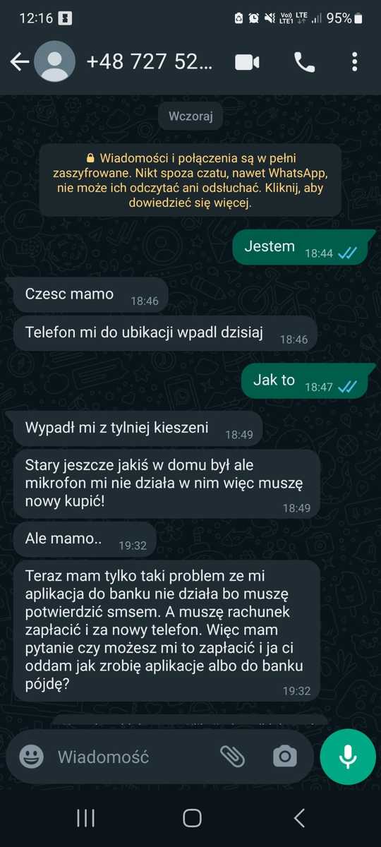 Takie wiadomości mogą trafić do każdego rodzica. Zaintrygowany lub jedynie spełniający prośbę „dziecka”, rodzic może od razu wysłać wiadomość w komunikatorze pod podany numer. Może też najpierw spróbować zadzwonić do syna lub córki pod dotychczasowy numer, aby dowiedzieć się, co się stało. Jeśli dziecko odbierze, to wszystko się wyjaśni. Jeśli jednak dziecko nie odbierze telefonu, będzie miało wyłączone urządzenie albo akurat będzie poza zasięgiem, to dla rodzica, opisana w otrzymanej wiadomości sytuacja stanie się prawdopodobna.