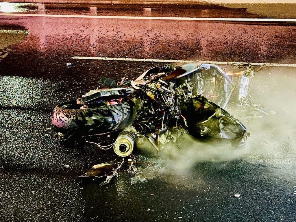 Kierowca jednośladu spadł na jezdnię, a sportowa maszyna przeleciała przez bariery energochłonne i zatrzymała się dopiero po drugiej stronie ekspresówki. Ścigacz niespodziewanie stanął w płomieniach. Na miejsce natychmiast ruszyły służby ratunkowe; straż pożarna PSP Wołomin, OSP Zielonka, policja oraz karetka pogotowia. Pilnej opieki medycznej wymagał motocyklista, który ranny leżał na pasie zieleni. Z ogólnymi potłuczeniami i urazem bioder został zabrany do szpitala. Strażacy przy użyciu „szybkiego natarcia” sprawnie ugasili palący się motor i zabezpieczyli wycieki paliwa. Rodzinie z auta osobowego nic się nie stało. Teraz funkcjonariusze Wydziału Ruchu Drogowego Komendy Powiatowej Policji w Wołominie będą ustalać co było bezpośrednią przyczyną tego zdarzenia. Wypadek spowodował spore utrudnienia w kierunku Warszawy.